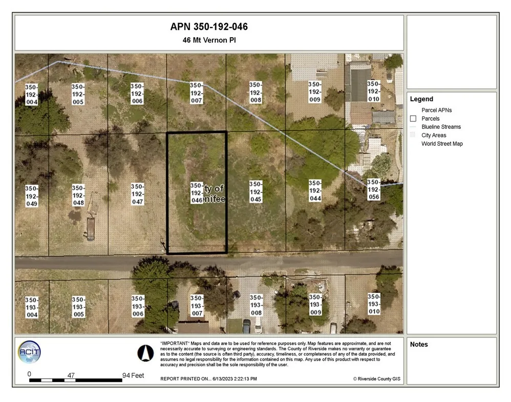 Wonderful Investment on this .12 Acres Vacant lot located on a paved road and located in an existing neighborhood surrounded by homes, utilities in street, Lot measures roughly 50 Ft road front X 100 Ft long, Adjacent .12 Acres Lot for sale also OC24064925. At the present time there is a moratorium on new construction in this area until the city sewer system is in place, Please call Menifee City Water District for more information, Property located north of 23559 Mt Vernon Pl