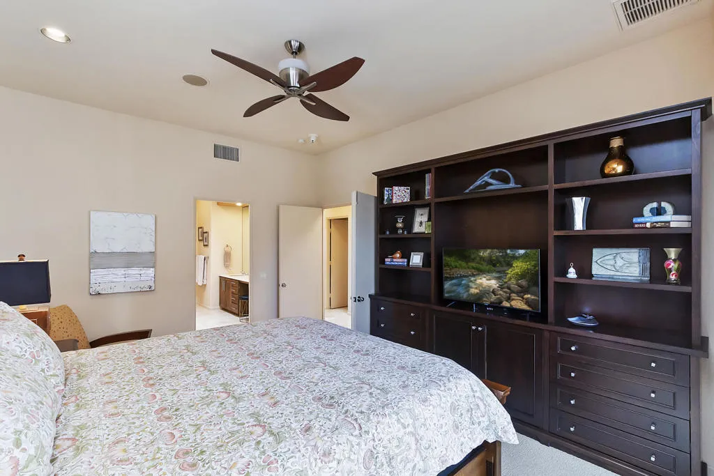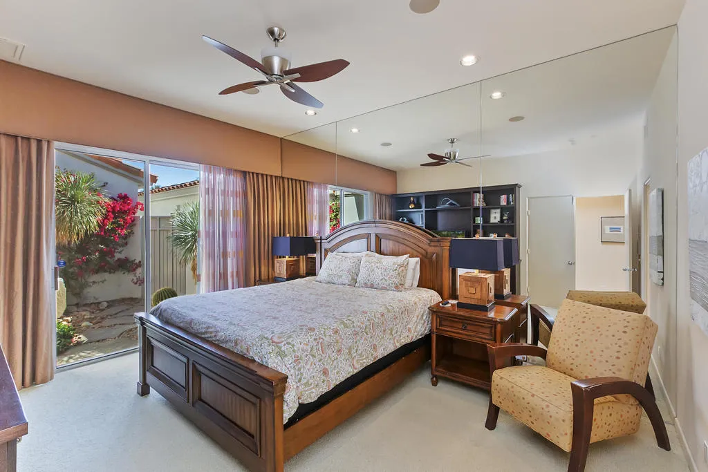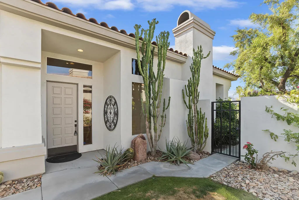 Available for the 2027 season. Spring and summer months are avail able at a lower rate.Experience the ultimate desert lifestyle at this beautifully upgraded, south-facing property in the prestigious Indian Ridge Country Club. This highly sought-after lease features a prime location just steps away from the community pool and spa, situated on a quiet interior street with exceptional curb appeal. The home boasts elegant decorator touches throughout, including newer cabinets in the bathrooms, travertine flooring, custom cabinetry, luxurious window coverings with remote controls, and a serene fountain in the atrium. The desert landscaping and electronic sun shades in the great room add to the comfort and charm of this property. The spacious master bedroom includes a California King bed, while the guest bedroom and den are furnished with a Queen bed and a Queen sofa, respectively. Centrally located, this home is just minutes away from the vibrant El Paseo shopping and dining district.Please note: No club privileges are available with this lease. Don't miss out on this exceptional opportunity to enjoy the best of Indian Ridge Country Club living!