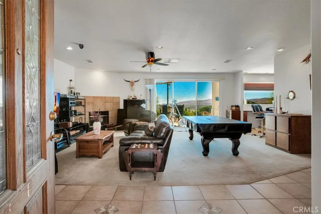 Beautiful views high in the hills in the very desirable country club neighborhood is this modern style gem of a home on a large over a half acre lot. Featuring 3 bedrooms, 2 baths and a bonus room for an office, den, studio or other. The great layout boasts a split bedroom design with a large primary bedroom with a beautiful ensuite bathroom. The primary bathroom has dual vanity sinks and a large walk in closet. The living area is also spacious and has a great view from the near wall length windows and sliding glass doors. Pull up to the exhibition kitchen counter which makes for a great entertainers spot for those who love to cook. Plenty of cabinetry in the kitchen and a lot of counter space. There are really nice tile floors in the entry, kitchen, dining area and bathrooms and the bedrooms are carpeted. The laundry area is also well equipped with plenty of counter space and storage and the 3 car garage provides ample space for your vehicles, tools or toys. It is obvious that the previous owner's pride of ownership provides for a well maintained and cared for home. You will find that the homes location is a great attribute. Being high up in the hills with no neighbors behind the home to obstruct the stretching views across the valley you can see for miles. The fully fenced back yard is a relaxing retreat with nice patios a gentle slope and private views. From this location it is not a far drive to the shops, restaurants and venues of Yucca Valley, chic Pioneertown and downtown Joshua Tree as well as only just over 20 minutes to the main entrance of the Joshua Tree National Park itself. Also just under a half hour drive to the Palm Springs area with it's great restaurants, shops, many wonderful theaters and Acrisure Arena, home to the Firebirds and some incredible concerts and shows. Entertainers delight! Come take a look and you will want to make this one your new home.