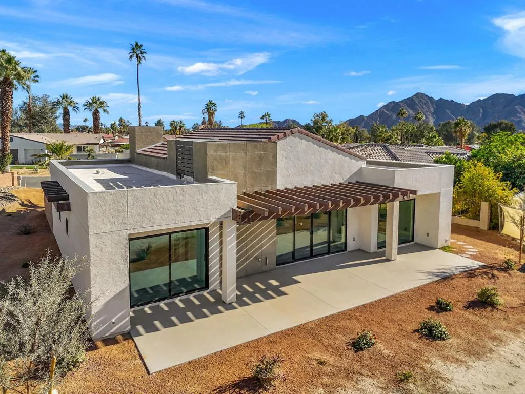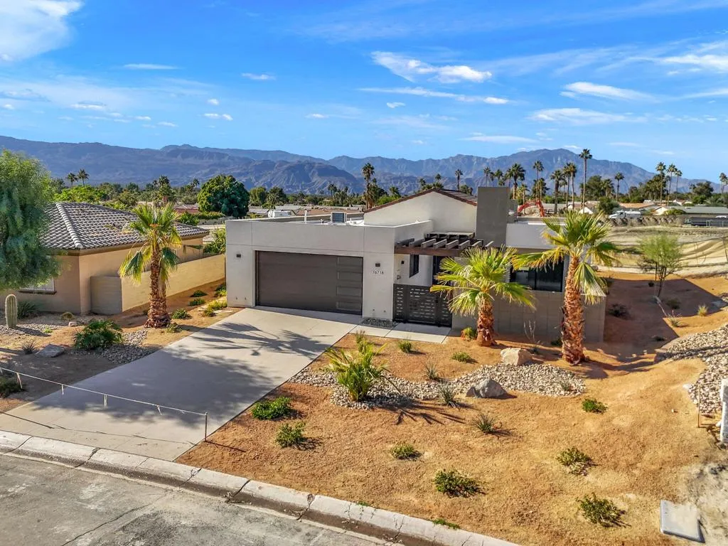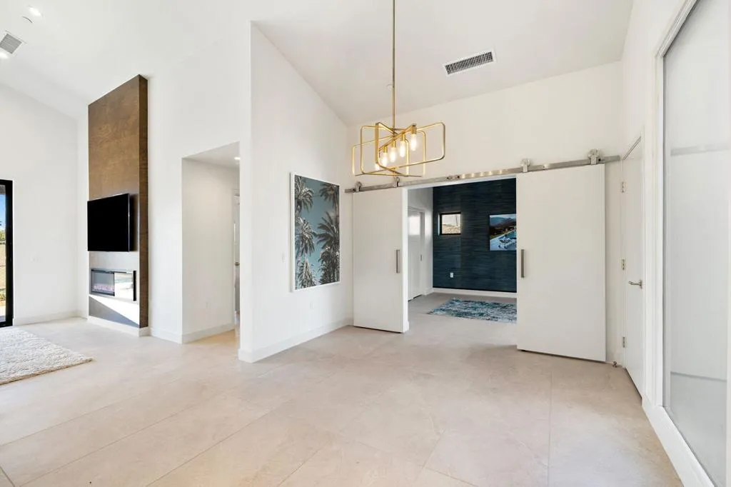 A LIFESTYLE former Corterra model home located within Palm Desert Country Club. Home offers 3 bedrooms, 2 bathrooms and modern designed living space. GREAT ROOM, with vaulted pitch ceiling, sliding glass doors open to south/west facing private Patio with views of the Santa Rosa Mountain Range. Kitchen is a chef's delight, featuring Upgraded Cabinets, Breakfast Island, Stone Counter tops, Brass fixtures, and Stainless-steel Appliances. Living area complete with Fireplace, Dining area, Large Porcelain Tile flooring throughout and Barn doors for added open space. All BEDROOMS are designed for comfort with sliding Glass doors opening to outdoor Patios. The PRIMARY bedroom includes a bathroom ensuite, large Shower Glass enclosure, double sink Vanity, Stone Counter top, Brass fixtures, Back-lit Mirror, and walk-in custom-designed closet. The GUEST bedroom offers Pocket-Door access to hallway Bath/Powder room with tub/shower combination and custom design closet. The DEN/Office/Bedroom features a custom-designed closet and sliding Glass doors opening to the east-facing Private Walled enclosed Courtyard. The 2-bay GARAGE with custom overhead insulated door, epoxy floors, and air conditioned. Desert landscape with sand-finished driveways, walkways, and patios. Enjoy Palm Desert Country Club amenities with Golf Course, Clubhouse, Restaurant, Bar, and Pro Shop. A must-see home on your tour of fine new built homes.