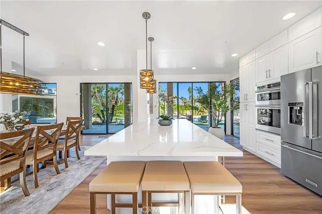 (Pricing reflects the lowest rates of the year; rates may be higher during peak season and other months.) Nestled on a spacious 0.5-acre lot, Casa Ironwood is a 3,224 square foot Mid-Century Modern masterpiece that embodies the spirit of Palm Springs. This stunning residence showcases an open floor plan, abundant natural light, and a seamless flow between indoor and outdoor living spaces. The interior features warm hardwood floors that extend throughout, creating a sense of continuity and warmth. The living room is a true showstopper, boasting large windows that frame breathtaking views of the pool and surrounding desert landscape. A cozy fireplace invites you to relax and unwind on cool evenings, while plush seating arrangements provide ample space for socializing. The modern kitchen is a chef's dream, equipped with high-end stainless steel appliances, sleek granite countertops, and a spacious island with seating for casual dining. Adjacent to the kitchen, you'll find a formal dining area with a large rustic wooden table, perfect for hosting gatherings and enjoying memorable meals with family and friends. The property features three bedrooms, each with comfortable king size beds and stylish decor. The master suite, with its own private access to the pool area, offers a luxurious retreat with an en-suite bathroom featuring dual vanities and a walk-in shower. The heart of Casa Ironwood is undoubtedly the outdoor oasis. The sparkling pool and soothing spa beckon you to relax and unwind under the California sun. Lounge chairs provide ample space for sunbathing, while the surrounding landscaping creates a private and tranquil retreat. A unique bronze horse sculpture adds a touch of artistic flair to the outdoor space. Experience the magic of Casa Ironwood. Book your stay today and create lasting memories in this Palm Springs paradise.