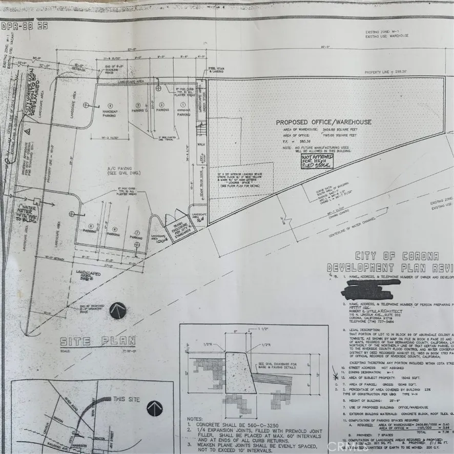 04/08/2025 Price reduced 50k!!! Incredible opportunity with the .25 Acre "Light Industrial" (*M1) vacant lot near the center of Corona! This property is flat and usable with all utilities at the street. The M-1 (Light Manufacturing) Zone is purposed for light manufacturing & industrial uses. The M-1 zone is to provide for manufacturing uses that are generally passive because the M-1 zone can be situated next to residential & commercial areas. A long list of potential/specifric uses are listed on the City of Corona's website under Zoning Code. This is a great location near the Corona MetroLink station, near shopping & restraunts, & with quick access to the 91 & 15 freeways! ***Current owner aquired upon his purchase the original full-size paper plans for a proposed office/Warehouse building that includes a full set of existing drawings for an office 1,165 square feet. Warehouse 3409.36 square feet.***
