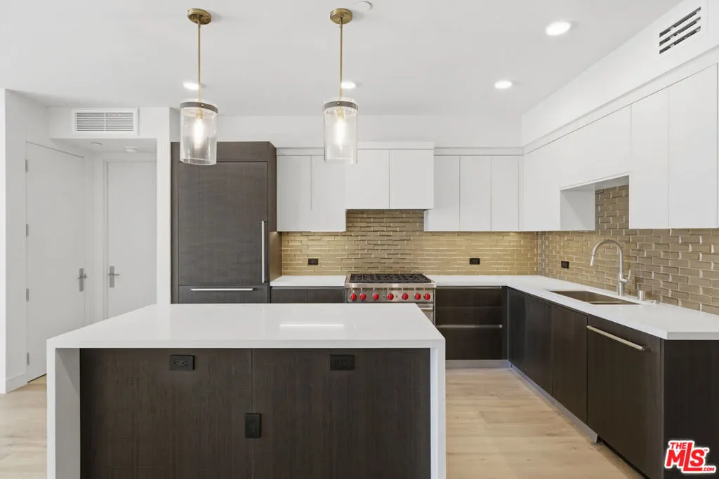 One of the last remaining south-facing residences at Encore Brentwood, Residence 304 represents the largest non-three-bedroom floorplan currently available in the building and one of just ten remaining floorplans available in Brentwood's only newly constructed, premium-amenity luxury building. Spanning approximately 1,414 square feet with 2.5 bathrooms, this exceptional 1+Den layout lives like a two-bedroom while offering scale, light, and one of just two remaining residences in the building with sweeping Westside views like this. With its coveted southern exposure, the residence is filled with beautiful natural light throughout the day and enjoys expansive views stretching across the Westside, creating an airy and elevated living experience. The open-concept design seamlessly connects the kitchen, dining, and living areas, delivering both flow and functionality in a thoughtfully proportioned layout. Enhanced by larger appliances and a more spacious footprint than comparable plans, this home stands out as one of the most desirable two-bedroom-style offerings at Encore. Wide-plank hardwood flooring, custom German closets, and a chef-caliber kitchen featuring Sub-Zero and Wolf appliances reflect the refined level of finish throughout. Encore Brentwood offers a curated collection of resort-style amenities, including a state-of-the-art fitness center, yoga and meditation studio, pool and spa with cabanas, outdoor fire pit, and a tranquil community garden. Residents also enjoy a screening room, conference space, rose garden, and an outdoor kitchen complete with pizza oven and BBQ ideal for both entertaining and retreat. Secure gated parking and 24-hour monitored security provide convenience and peace of mind. Located moments from San Vicente Boulevard's premier dining, shopping, and neighborhood charm, this is a rare opportunity to secure one of Encore Brentwood's most spacious, light-filled, and uniquely positioned residences. *These photos reflect a similar unit.*
