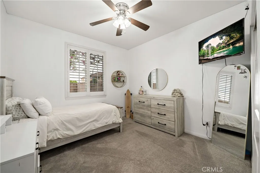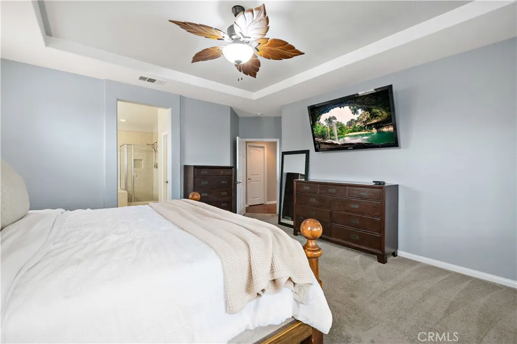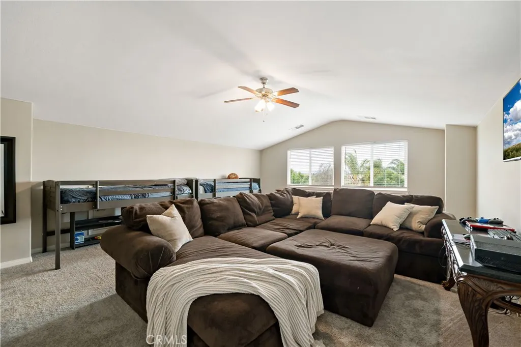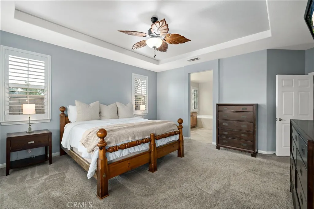 Rare opportunity as this floor plan rarely comes up and there is only a handful that were built in the neighborhood. Nestled in the picturesque Spencer’s Crossing Community, this uniquely designed 3100+ sq. ft. home is sure to captivate your heart! It lives like a single story with all bedrooms on the main level, but boasts a HUGE loft that stands alone on the second floor! The stunning foyer with vaulted ceilings and a grand staircase immediately scream OPEN CONCEPT! The true gourmet kitchen features sparkling stainless-steel appliances, a double oven, a 5-burner gas cooktop and range, upgraded granite counters, and an immense amount of cabinet space! The living room is equipped with wired surround sound, an over-sized media niche, and a charming fireplace. Powder room around the corner is perfect for your guests. The primary bedroom boasts a private hall entrance, tray ceiling, and a beautifully upgraded, enormous 5-piece bath, complete with a jetted soaking tub! The three remaining bedrooms are located down a second private hallway, along with an additional full bath with double sinks, and tons of linen storage. The laundry room on the main level also has an upgraded sink and counter space! The beautifully landscaped, private yard features a covered patio with two outdoor ceiling fans and recently installed turf. Massive side yard would make a great space to grow your own veggie garden or would be an excellent dog run. Notable features, Plantation shutters, hardwood floors, and ceiling fans throughout! Insulated 3-car split garages. Whole house fan, solar panels, and Nest digital thermostat included! Close to the community clubhouse, pool, and parks! Murrieta School District! Short drive to Temecula Wine Country!