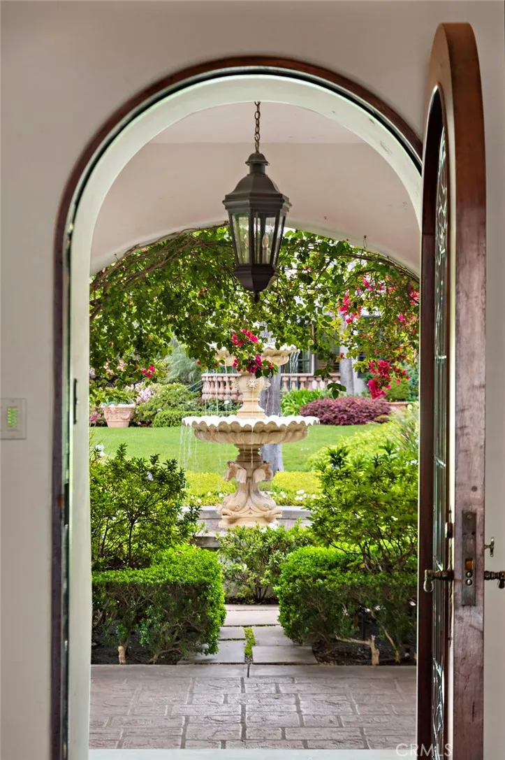 This estate is a compound unto itself, encompassing a guest house, carriage house, multiple garages, a recreation center, and an outdoor veranda exceeding 1,000 square feet, perfectly suited for grand entertaining or quiet sunsets. A circular motor court, central fountain, and garden pathways invite discovery. At the rear, an infinity-edge pool and spa command dramatic views by day and glittering city lights by night.