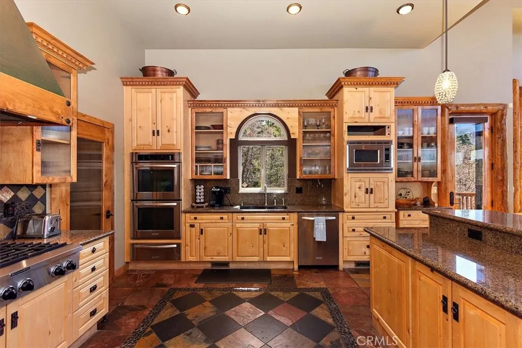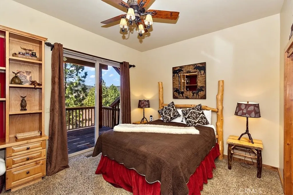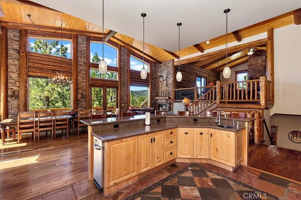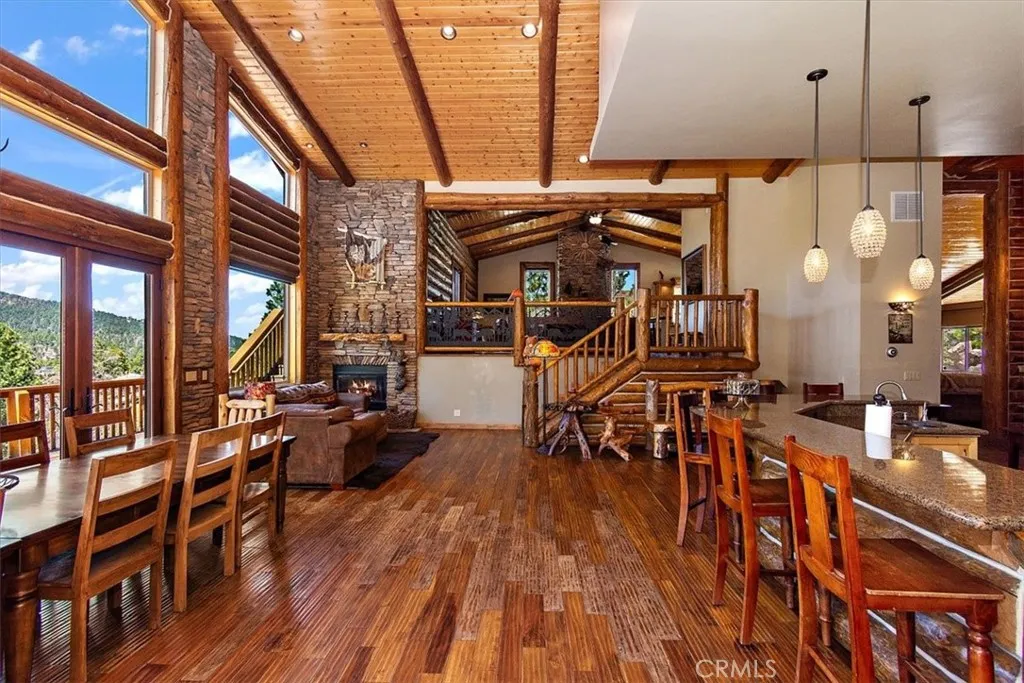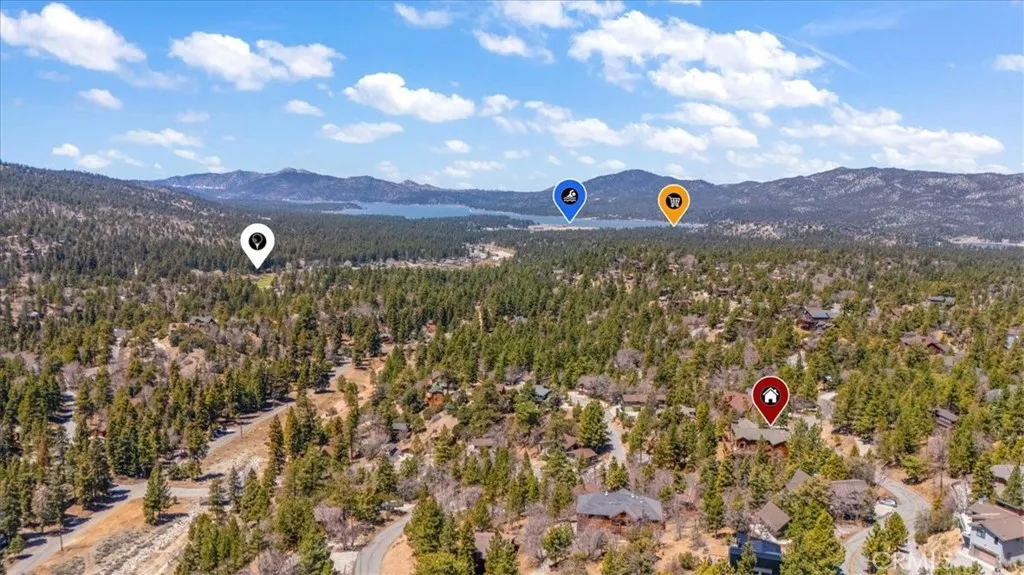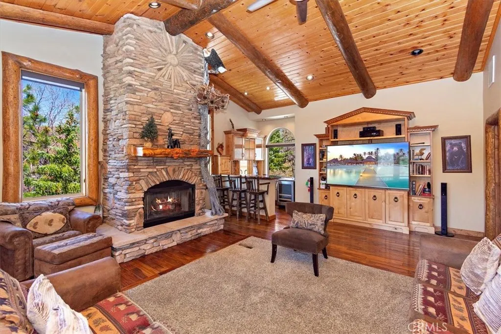 This epic custom-built log home has some of the most commanding views of the lake and ski-slopes in Moonridge. The pinnacle of luxury, this property has so many amazing amenities! Gourmet stainless-steel kitchen open to massive dining room with wide views of the slopes through the full wall of display windows accented by log and stonework; Five stone fireplaces including one at the deck across from the spa just outside the primary suite and one inside the primary suite along with a wet bar; detailed artisanal work in the custom laid mosaic floor tiles, custom carved fireplace mantles with artistic details, and layers upon layers of knotty-pine log accents. This property has many entertaining spaces inside and out, including a parlor off the entry with a fireplace, lofted game room with another fireplace, wet bar and counter seating, a shady front porch, a deck off the loft with lake views, a deck off the dining area with ski slope views, a secluded deck off the primary suite with spa, and a deck off the ground floor with more views. There’s also a fifth sleeping area off the lower hallway. In addition to the mountain charms, this home has modern features such as Nest Thermostats, exterior cameras, two dual-zoned forced-air heating units, air-conditioning unit on the top floor, two tankless water heaters, heated driveway, heated towel-rod and travertine floors in the primary suite, a gorgeous outdoor water feature, and three-car attached garage. Located near ski slopes, national forest hiking trails, shopping and dining, events and activities, this property has been a successful vacation rental and could make a wonderful family getaway or peaceful residence where the closeness to nature makes profound memories.
