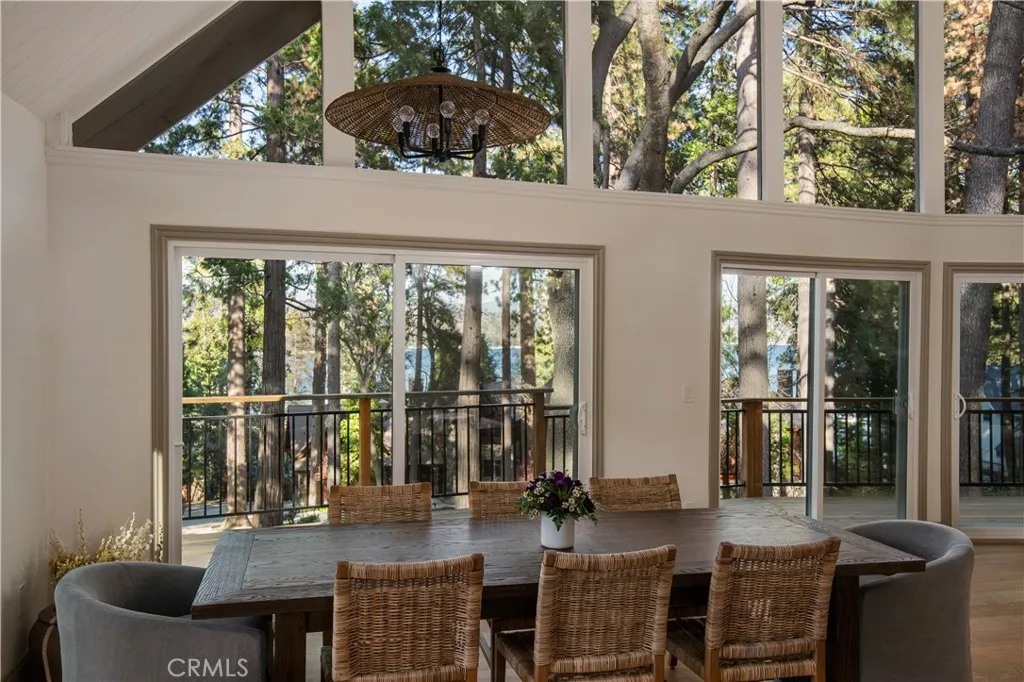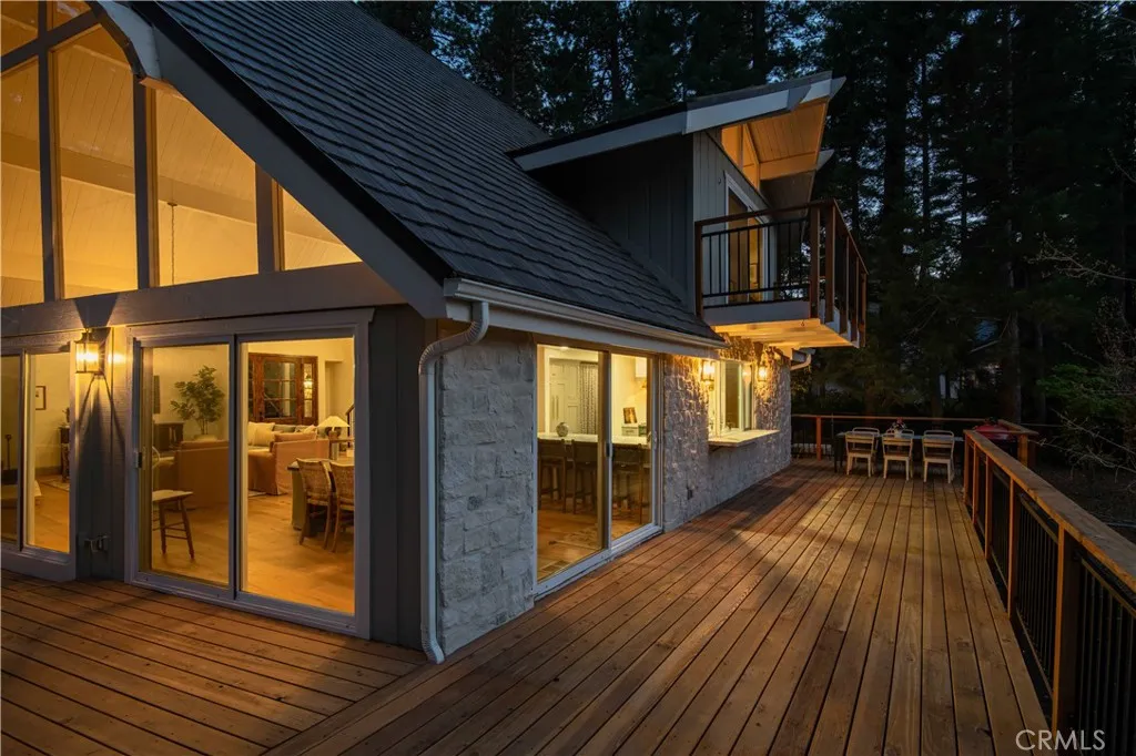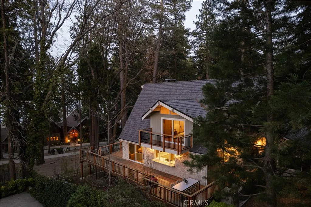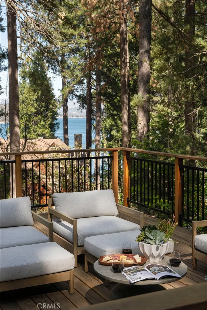 The SkyStone LakeHouse. Welcome to luxurious lake living in the exclusive, guard-gated community of Point Hamiltair—Lake Arrowhead’s most prestigious and sought-after enclave. Known for its 24/7 security, concierge services for home upkeep, and a long-standing legacy of celebrity and socialite residents, this community offers the ultimate in comfort, privacy, and prestige. Located directly across from a $12 million estate and just a short stroll or golf cart ride to your private boat slip, this exquisitely remodeled lakeview home blends timeless mountain charm with top-tier modern upgrades—offering a true turnkey lifestyle. From the moment you arrive, you’re greeted by breathtaking lake and tree views framed by soaring high-beam A-frame ceilings and an iconic wall of windows. Natural light pours into the open-concept living space, where wide plank European white oak floors and a floor-to-ceiling stone fireplace create the perfect balance of warmth and sophistication. The spacious living area is ideal for entertaining, with abundant seating to relax and soak in the views. The gourmet kitchen is a designer’s dream, featuring marble countertops, custom cabinetry, a show-stopping Ilve Italian range, European fixtures, and a convenient pass-through shelf that connects directly to the expansive outdoor dining area. Step outside to your wrap-around deck, thoughtfully designed with multiple lounge and dining zones, a built-in BBQ area, and serene spaces to enjoy al fresco meals beneath the stars. The main-level primary suite is a tranquil retreat with a walk-in closet and spa-inspired ensuite bathroom, complete with marble counters, a custom tile steam shower, and luxury plumbing fixtures. Upstairs, two bright guest bedrooms with vaulted ceilings share a stylish full bath with a walk-in shower and designer vanity. The lower level offers a brick-floored entertainment lounge with a second fireplace, wet bar, game area, ¾ bath, and direct access to the fenced yard and lower patio. Additional upgrades include a new roof, rebuilt decks and railings, exterior stonework, concrete walkways, professional landscaping, and a subterranean sprinkler system. Offered beautifully furnished (furniture negotiable), this lake view masterpiece is ready to enjoy. A rare opportunity to own in one of Lake Arrowhead’s most iconic and luxurious communities.