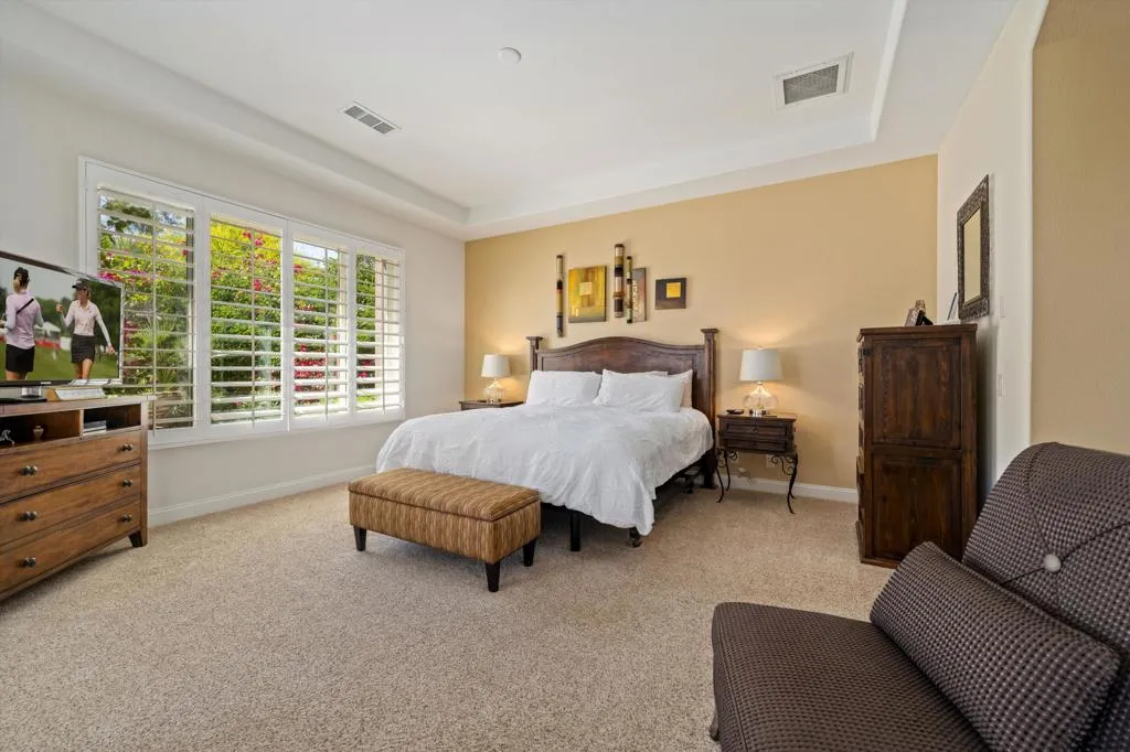 Welcome to Mira Vista located in the city of Rancho Mirage. Our beautiful Escondido plan offers 2 bedrooms, 2 baths and a den, golf course and mountain views and with privacy for the pool area and back patio. Upon entering, you will love the travertine flooring leading to the large great room with 12' ceilings and a fireplace, with plenty of space for it's gorgeous dinning room table. The open concept kitchen offers top of the line appliances, granite counter tops and a large sitting/serving bar. The primary bedroom shares the great Southern fairway views. Has a large walk-in closet, separate shower and tub. The guest bedroom is large and offers an en suite bathroom. The den/TV room is located at the front of the home and large enough for you and your guests to relax and watch TV. The deep rear yard features a saltwater pool and spa and lots of patio area and privacy. The community offers 2 lighted pickle ball courts and 1 lighted tennis court.Available November 2025 through January 2026 at $5,500.00 Also available for Summer Rental, call listing agent for information. Not available Feb. & Mar. 2026
