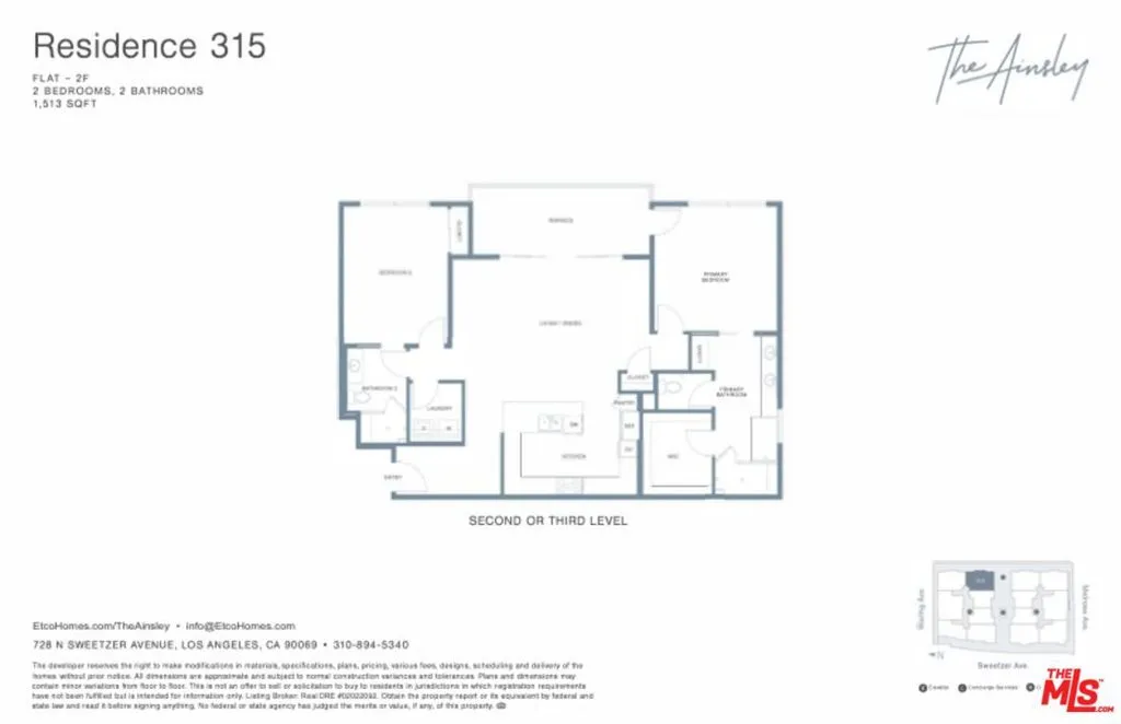 Welcome to The Ainsley, nestled on a highly walkable, tree-lined street just steps from the best of Melrose. Residence 315 is a 2-bedroom, 2-bath single-level home offering 1,513 SF of refined living space, with an open floor plan that seamlessly connects the gourmet kitchen to the spacious great room. Premium interior finishes include Sub-Zero and Wolf appliances, Gessi plumbing fixtures, a Hydro Systems soaking tub, and Snaidero Italian cabinetry, all complete with Caesarstone countertops throughout. Additional features include an entry corridor, dedicated laundry room, outdoor terrace accessible from both the living room and primary bedroom, and two side-by-side parking spaces in the subterranean garage. The primary bedroom features an expansive walk-in closet and dual vanity. Community amenities include on-site concierge services, a resident lounge, fitness center, yoga and training rooms, and more.