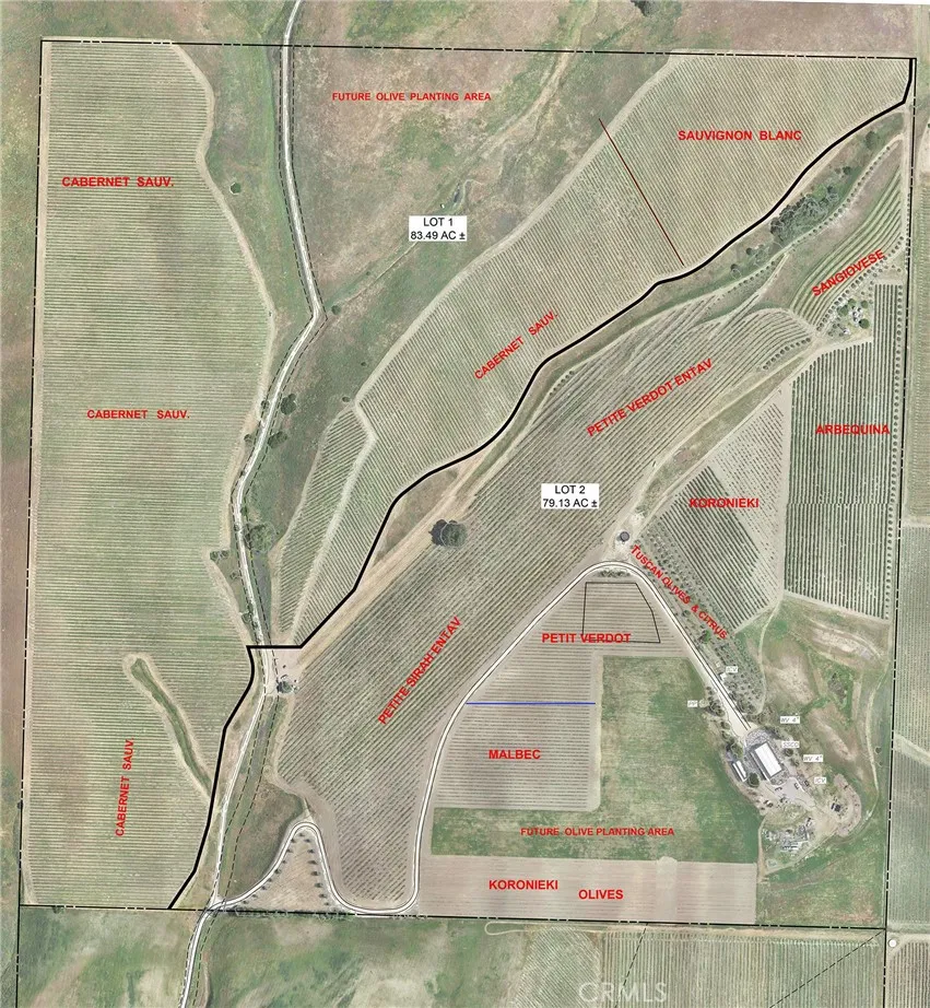 This breathtaking and prestigious 162.61 acre Olive Ranch and Vineyard is located in the rolling hills of the Paso Robles Estrella Appellation. Specializing in the growing and production of award-winning Extra Virgin Olive Oil and premium wine grapes. The property features a beautiful 4950 sq.ft. two story barn. The lower floor of the barn is equipped with a permitted bathroom, shower, water softener, laundry, and septic system. Heavy concrete paving surrounds the entire barn. Just off from the barn is a stunning open concept entertainment center with fountain, water misters for warm days and a beautiful fireplace for cool evenings. The shooting range located on the other side of the barn has a 10X10’ concrete shooting stand, aiming out to movable short and long range targets. The property agricultural mainstay of the property is its 87 acres of vineyards (Cabernet Sauvignon, Sauvignon Blanc, Petite Sirah, Malbec, Petite Verdot, Sangiovese) and 15+ acres of Olive trees (Arbequina, Koronieki and Mixed Tuscan). The Vineyards have profitable leases, ending in 2028 and 2047. There is a 1 acre lavender field and another 18.8 acres of additional olive tree or vineyard expansion. Five 10,000-gallon water storage tanks co-located in a hill-top tank farm with electronic controls and water level indicators. The Irrigation system is gravity fed from tanks throughout the olive blocks and eastern part of the vineyard. The water is supplied by 2 permitted and vested wells. The wells are 650’ deep and produce 70-100GPM with no water table issues. Water quality is excellent and water pressure is 35-50psi throughout. Forever views Gazebo: 16ft. diameter, octagon, Amish style shade gazebo on heavy elevated concrete slab with electric fan and lights and views. The Bergey 10 Kw Wind Turbine Generator mounted on a 100 ft. tall heavy duty, galvanized steel tower structure also supports a wi-fi repeater station that is leased, providing free high power internet and wi-fi service to the property. This stunning property has numerous possibilities for the building of a primary Residence. Truly a special place that makes beauty, prestige and profitability a reality.