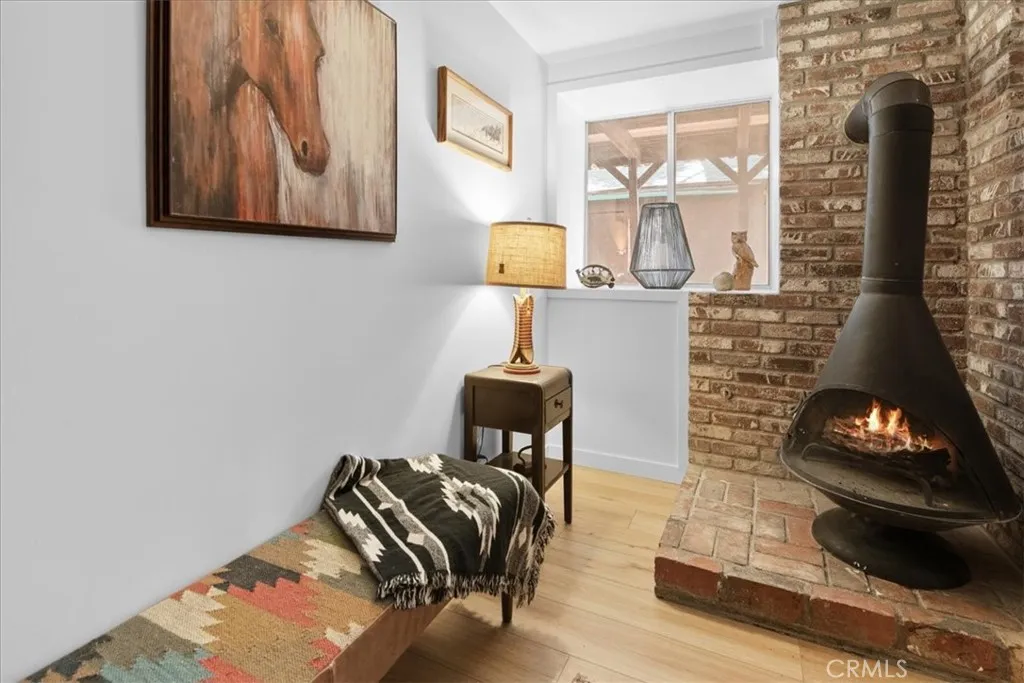 • Two inviting living spaces: upstairs features a brick fireplace; downstairs boasts a freestanding wood-burning stove