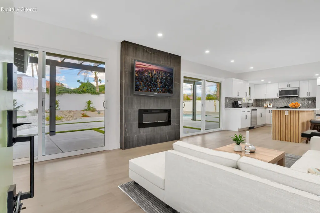 Discover this beautifully updated mid-century modern retreat where sleek design meets modern comfort. Perfect for entertaining orunwinding, this home offers seamless indoor-outdoor living with breathtaking mountain views. The stunning pool has been replastered with new plumbing,electrical, and new equipment, complemented by a newly installed Alumawood-covered patio, decorative stone, drought-tolerant landscaping, and a customputting green. Inside, the open-concept layout is flooded with natural light, featuring a chef's kitchen with quartz countertops, new stainless steel appliances,and a wood-accented dining island. Additional upgrades include new recessed lighting, new double-pane windows, and a cozy fireplace, creating a warm andinviting atmosphere. Spacious bedrooms, and chic bathrooms complete this stylish home, blending timeless mid-century charm with modern upgrades for theultimate Palm Springs retreat.