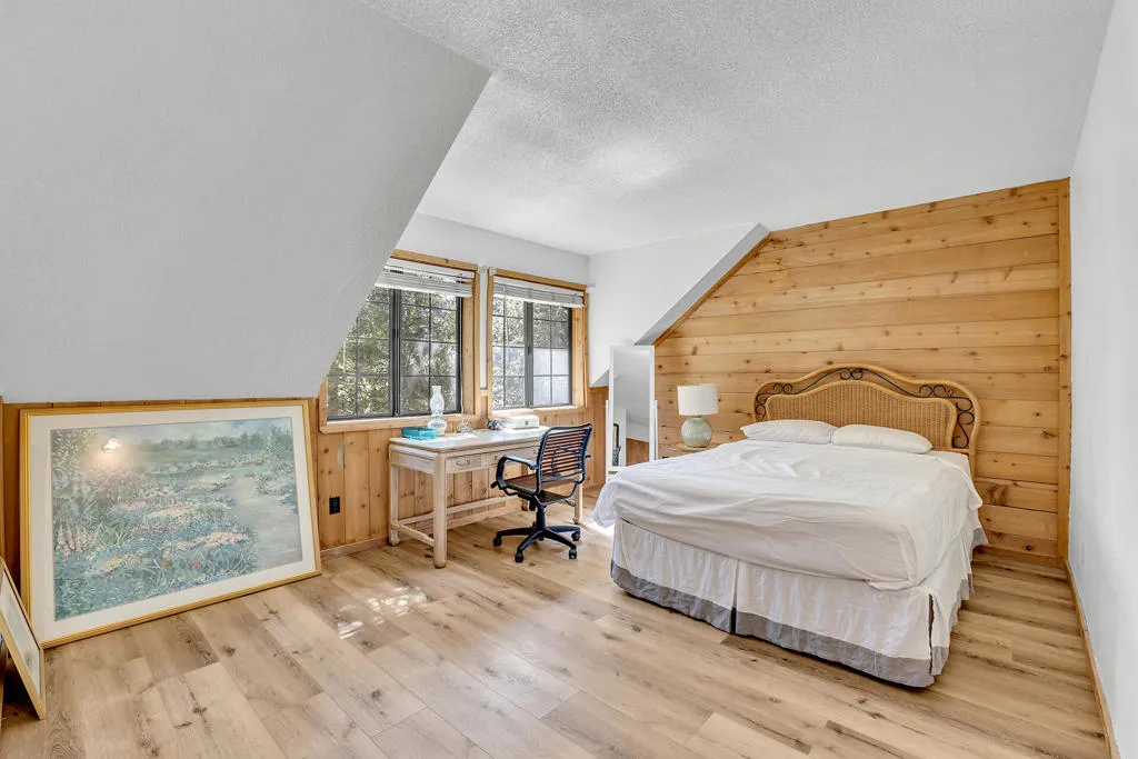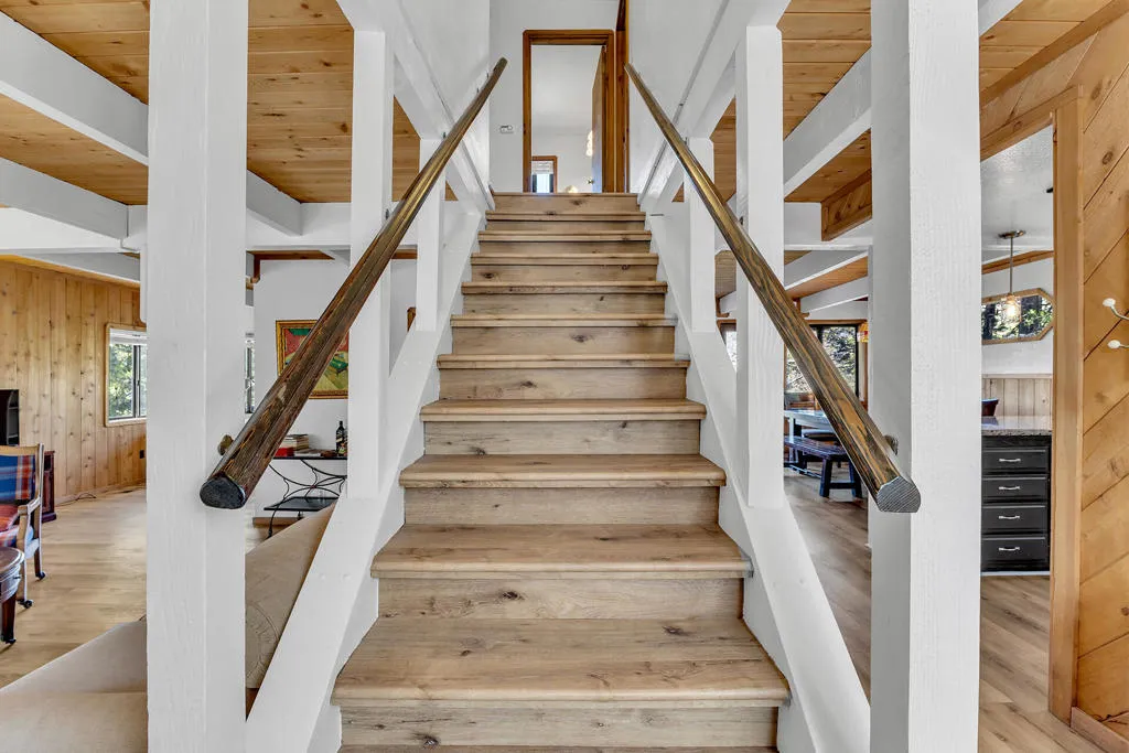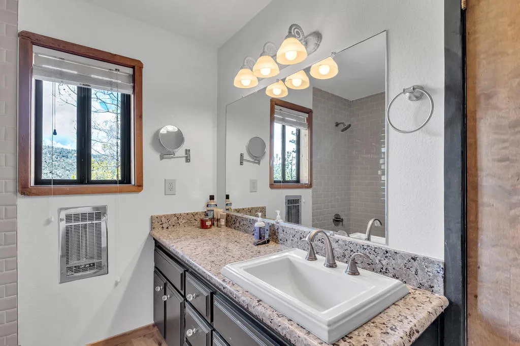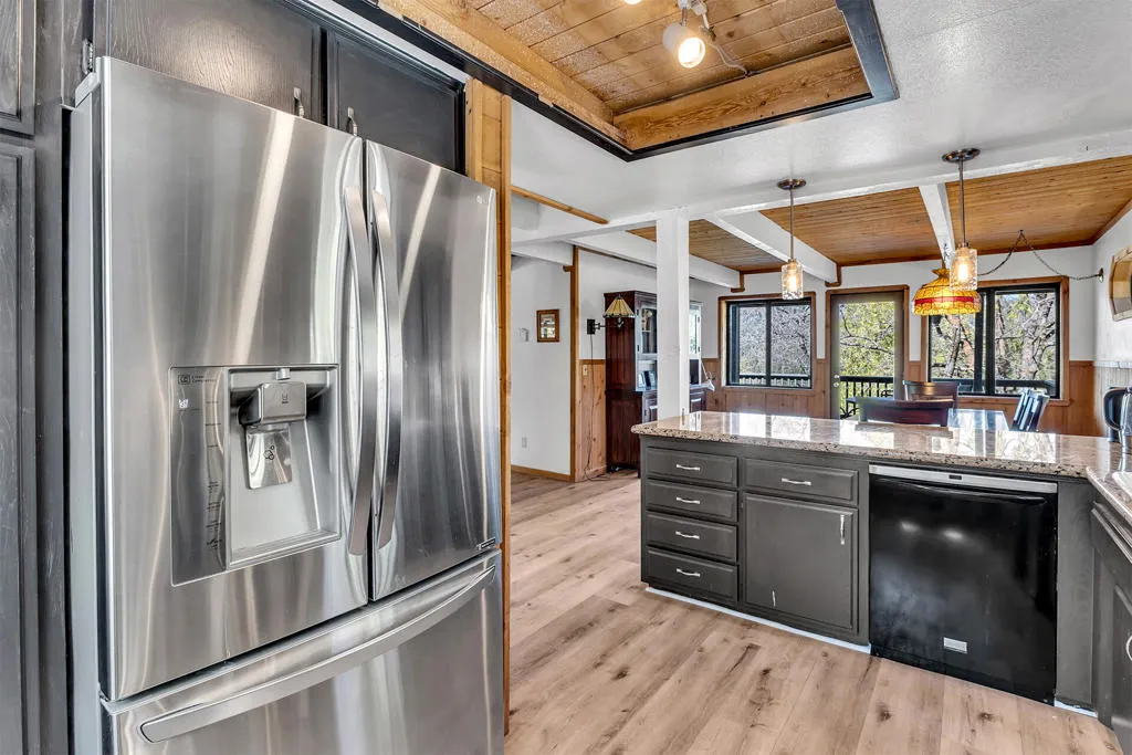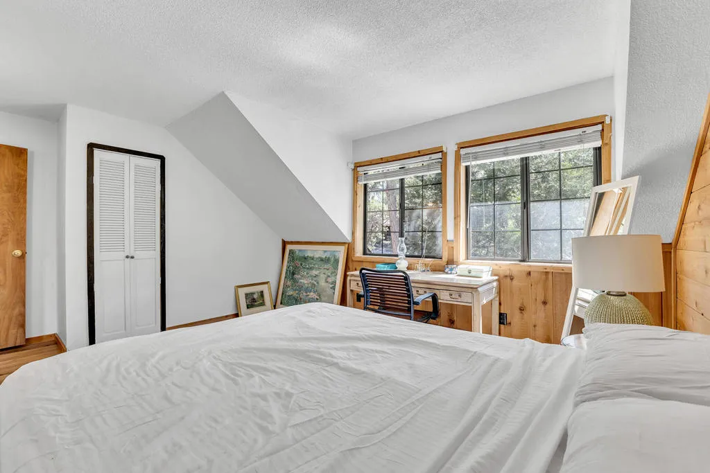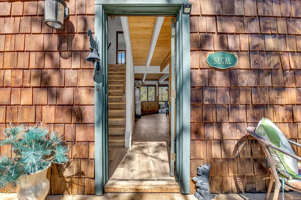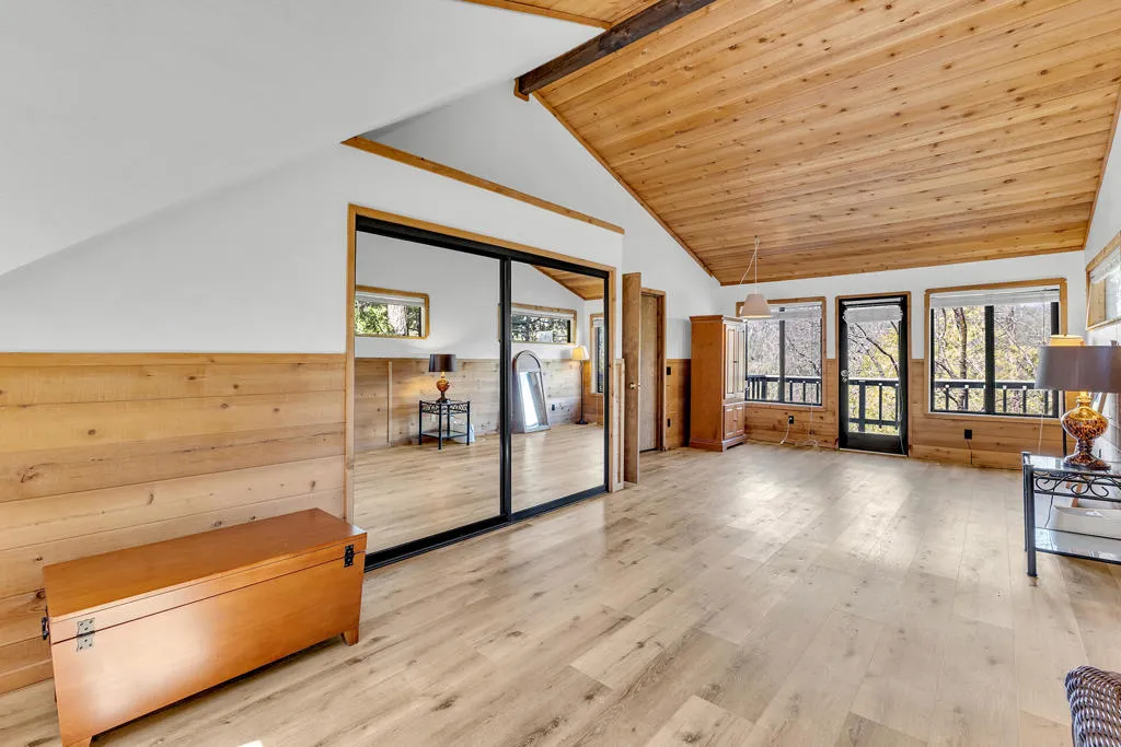 GLOWING SUNSET AND MOUNTAIN VIEWS! Located on coveted Double View Dr., a favorite with Idyllwild buyers, this charming 3-bedroom, 2-bathroom mountain home offers breathtaking views, modern updates and rare expansion potential with an included adjoining vacant lot. Recent upgrades include kitchen with granite countertops, stainless appliances, generous cabinetry and peninsula breakfast bar, a newly renovated upstairs bathroom, and beautiful new laminate flooring throughout. The expansive living room features a floor to ceiling propane brick fireplace, beamed ceiling and rich natural wood paneling. A dedicated office nook is a perfect work-from-home or creative space. A central dining area with beamed ceiling, has deck access for indoor-outdoor flow. The large cathedral-ceiling primary suite has private view balcony and remodeled full bath. There are two additional spacious bedrooms, one with a second private balcony and one with charming dormer windows, laundry area with washer and dryer included, central heat and A/C for year-round comfort, and 2-car parking pad. Near 1/2 acre (including the vacant parcel) is ideal for future expansion.