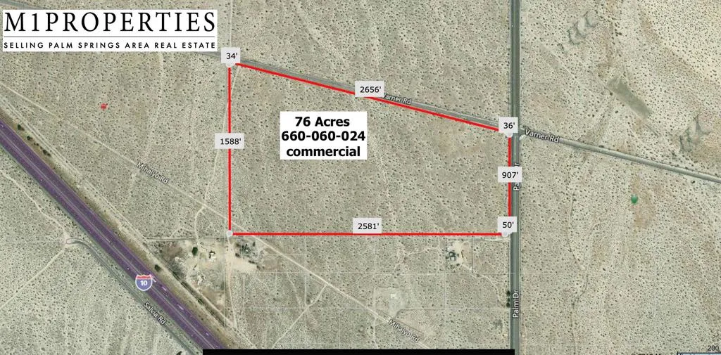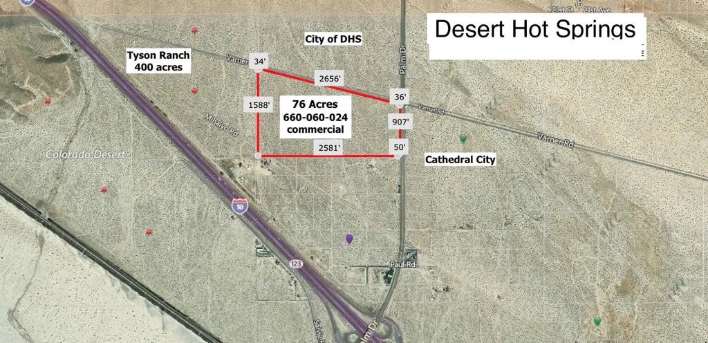 South west corner of Palm Drive and Varner Rd. Zoned commercial in city of Desert Hot Springs Highway Commercial and CBP commercial business park. One of the largest properties with commercial zoning near I-10 and Palm Springs / Desert Hot Springs