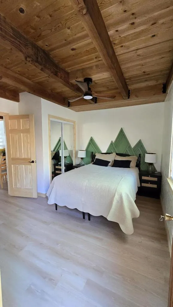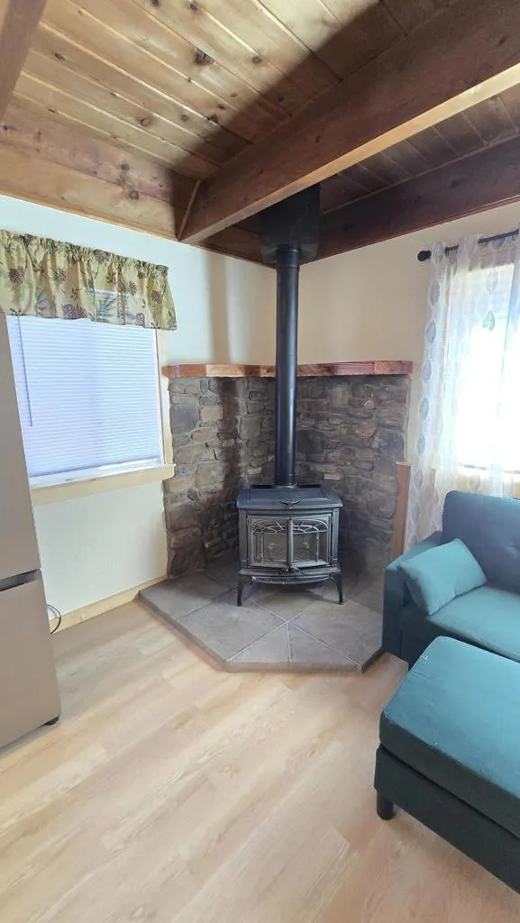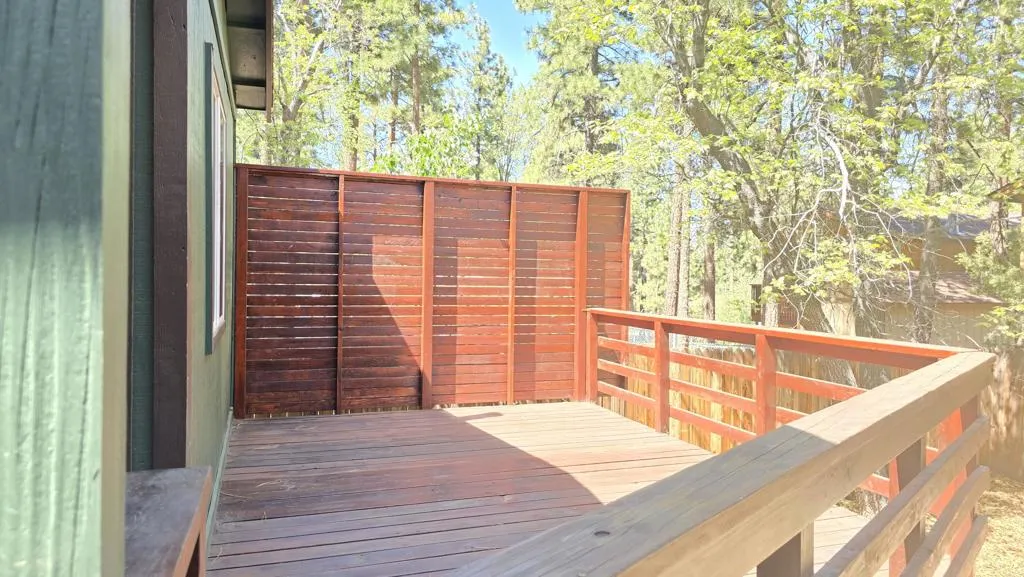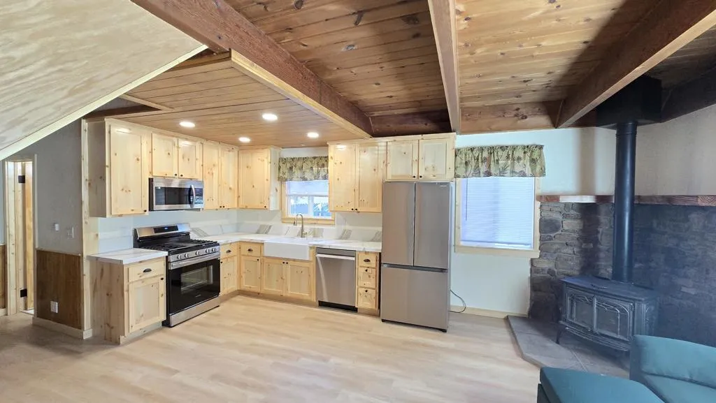 Gorgeous chalet mountain cabin. Completely remodeled interior (with permits), new kitchen (cabinets, countertops, and appliances), new stonework at wood stove, new windows, the decks are completely freshened up and have a privacy diffuser wall built at rear deck, freshly painted inside and out. This house is a perfect getaway vacation home. Fenced, partially furnished, 1.5 car garage, and a large 1/2 bathroom with laundry. There is a huge 17' x 19' space above the 17' x 19' garage that can be converted to livable space or simply can just be used for storage.There are only 2 bedrooms on tax rolls but that can be changed to a 3 bedroom on assessor records by simply adding a closet at an approximate expense of $1,000 each (2 upstairs bedrooms).