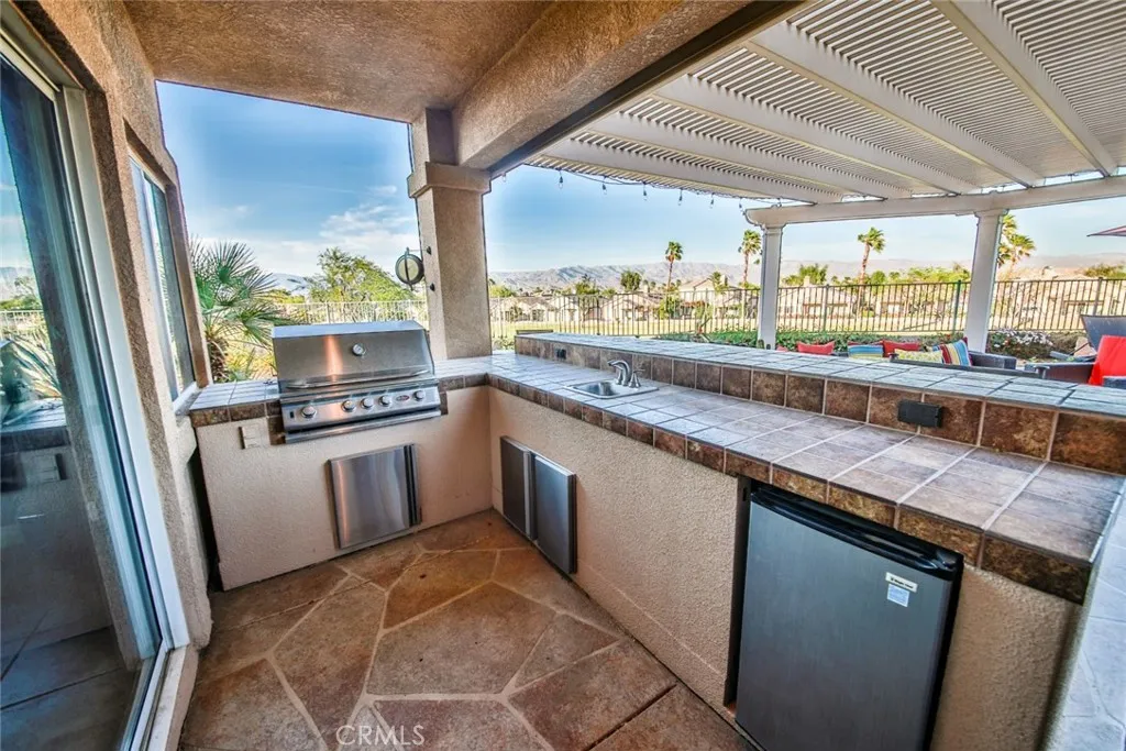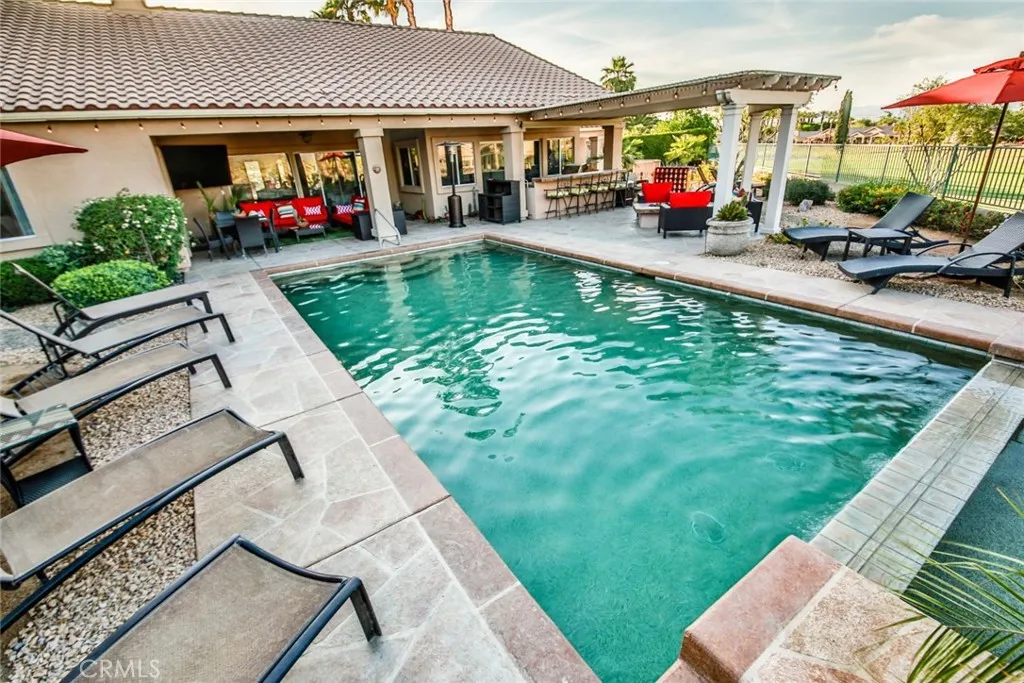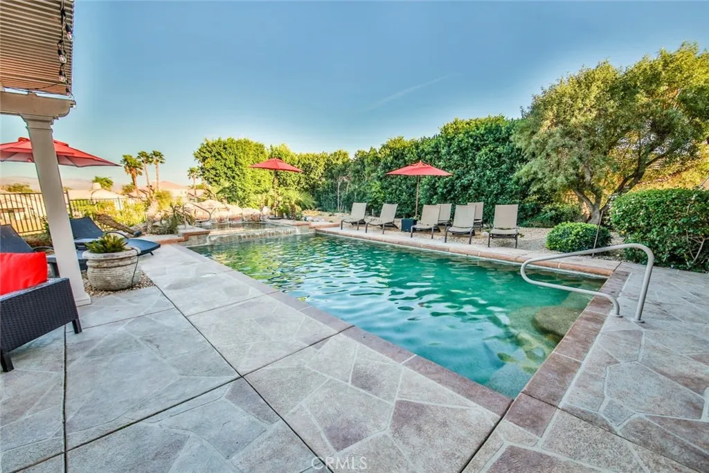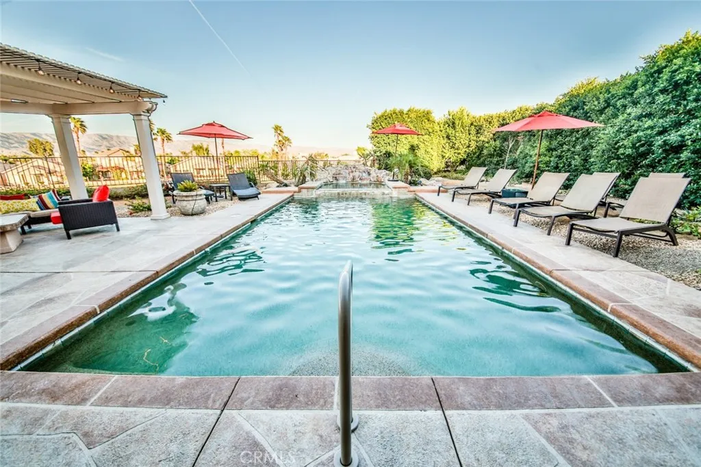 PLEASE ASK ABOUT OUR SPECIAL STAGECOACH OFFER ONLY FOR THIS WEEK!! Come relax in a desert oasis that has been described as an Instagram worthy home. Former model home sits on the fairway of the Big Rock Golf Course at Indian Springs and is the perfect location to watch the sunrise over the mountains, read a book under the misters, relax and get cozy at the outdoor fireplace and cook up a feast in the well stocked kitchen. The lot is almost half an acre with lots of private space and located at the end of a cul de sac with parking for 6 cars. The House consists of 4 bedroom 3.5 bath house is nearly 3,500 square feet which includes the game room in the air conditioned garage, all on one level and on almost a half acre of space so plenty of areas to relax and spread out. It's also very close to Coachella and the festivals and not too far away from downtown Palm Springs and all the high end restaurants. The newly renovated open kitchen (huge island and new cabinets and appliances) / dining room / living room layout is perfect for entertaining. There are multiple seating areas so you won't feel cramped. Watch a movie or golf on the big screen TV while cooking or just relaxing in the living room. Outside there is a private party pool and hot tub with waterfall to relax. Both can be heated prior to your arrival. We are also one of the very few rental homes that has a CHILLER to COOL the pool. As you may know the desert temperatures can get very high and as a result, the pool water gets very warm. This chiller can be turned on to make the pool feel much more refreshing to jump in on those very hot summer days. There is an outdoor kitchen with BBQ unit and natural gas piped in so no need to worry about running out of propane. There is a sink and outdoor refrigerator to keep your drinks cold so you don't have to run back and forth inside the house. The air conditioned game room will keep you busy for hours with a pool table, foosball table, air hockey, Golden Tee video game, surround sound and two big screen TVs. You can direct connect your phone to the stereo system and jam your tunes while watching movies and sports on the 2 big screen TVs. There is also a half bath, mini refrigerator and microwave in the game room/garage A pack and play and stroller as well as a dining room chair are available for the kids. 2 rollaways are in the master bedroom if your kids want to sleep in the same room as you.