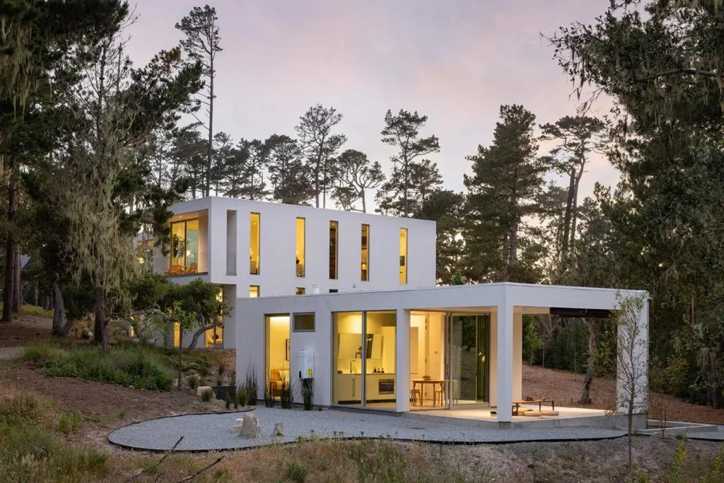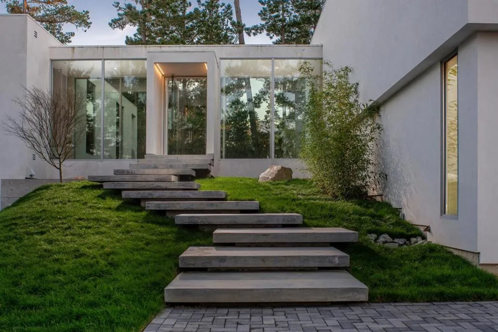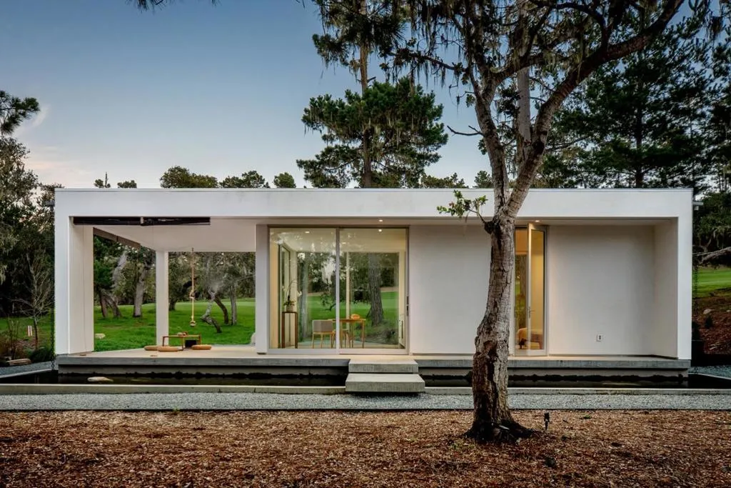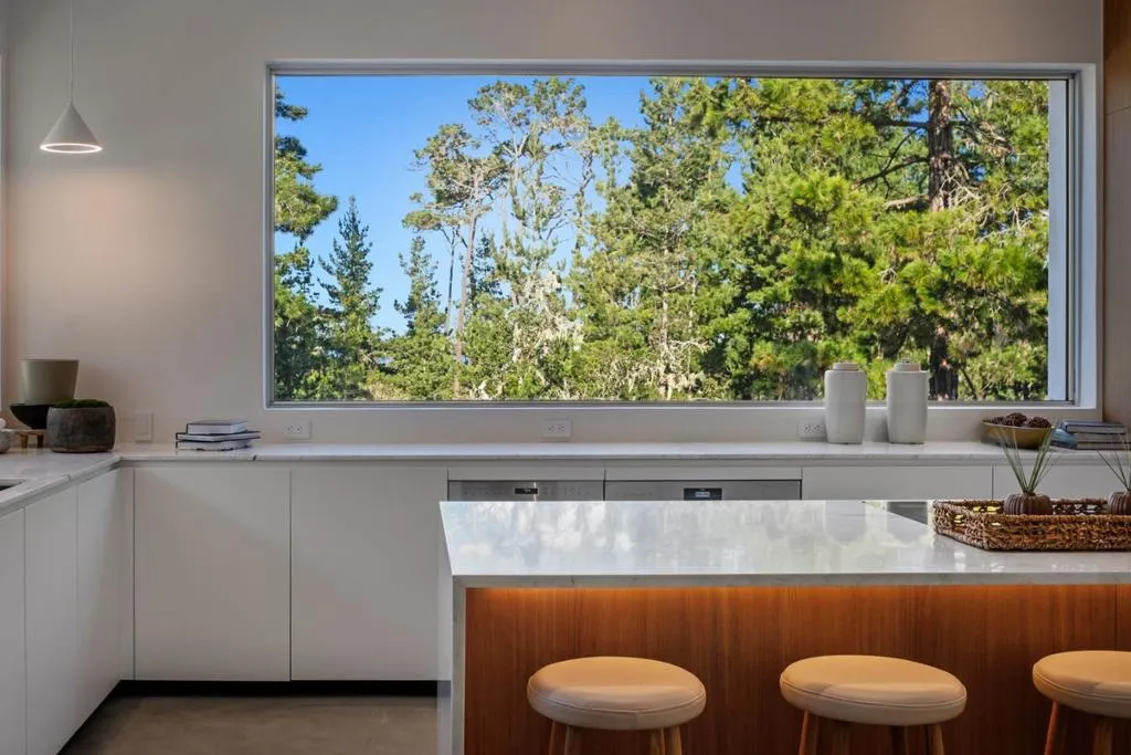 With sweeping views of Spyglass Hills 11th fairway and filtered ocean vistas, the Waterbridge House is an extraordinary Scandinavian-Japanese minimalist estate. This newly constructed compound is comprised of the stunning main house, a private ADU, and a Tea House (Guest House) floating on water. The striking architecture embraces intentional simplicity, blending natural elements with modern form. Two architectural axes, interior and exterior, guide you through spaces that reveal and conceal, including the "Waterbridge," a glazed walkway over a tranquil pond. The sculptural Cloud Steps lead to a light-filled interior where polished concrete floors, Western floor-to-ceiling windows, Italian concealed Infinity doors, and Poliform cabinetry define quiet luxury. Sustainability meets sophistication with triple-glazed windows, radiant heat, and an automated energy recovery system. From Sub-Zero, Wolf, and Miele appliances to Italian Flos lighting and Simply White plaster walls, every detail reflects enduring craftsmanship and environmental mindfulness. Located in the heart of Pebble Beach near The Lodge and by the Spyglass Club House, Waterbridge House is a half mile to the beach and a short drive from all the wonderful amenities of Carmel, Big Sur, and the Monterey Peninsula.