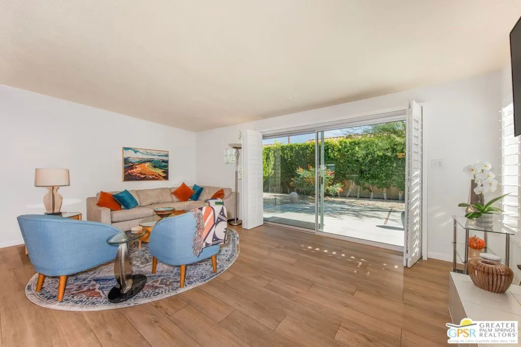 Exceptional Location in South Palm Desert! This charming Mid-Century home is ideally located within walking distance of the upscale shops and dining on the iconic El Paseo. Enjoy bike rides through the peaceful, scenic neighborhood, complete with stunning mountain views. The furnished home boasts an upgraded kitchen featuring stylish cabinetry and hardware, quartz countertops, a Koehler cast iron sink, and porcelain wood flooring throughout. The updated fireplace adds extra warmth and style to the living space. There are 2 OWNED solar systems, one for the pool and one for the house, which helps with rising electricity costs. The roof was replaced in 2024. Step outside to discover a beautifully upgraded Pebble Tech saltwater pool, a hot tub, and recently upgraded landscaping, perfect for relaxing or entertaining. Nearly every room in the home opens to outdoor patios, including a covered patio that has been added by the sellers off the living room, and the lush backyard, offering a seamless flow between indoor and outdoor living. The generous primary suite opens to a private south-facing pool area with breathtaking mountain views. The third bedroom offers flexibility, ideal as a home office or guest room. Make this your permanent home or weekend escape, this property has it all!