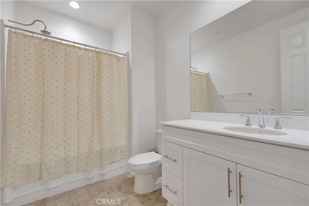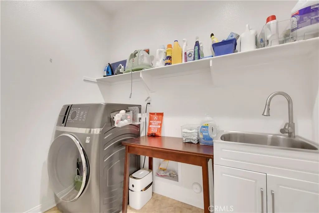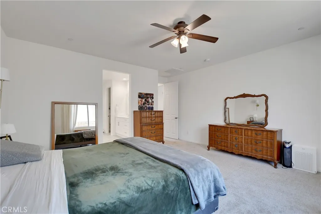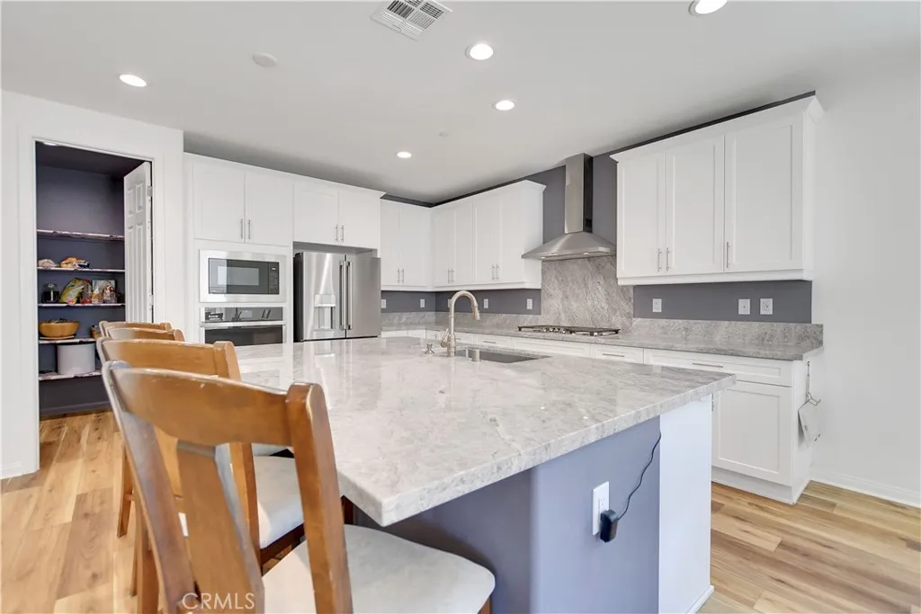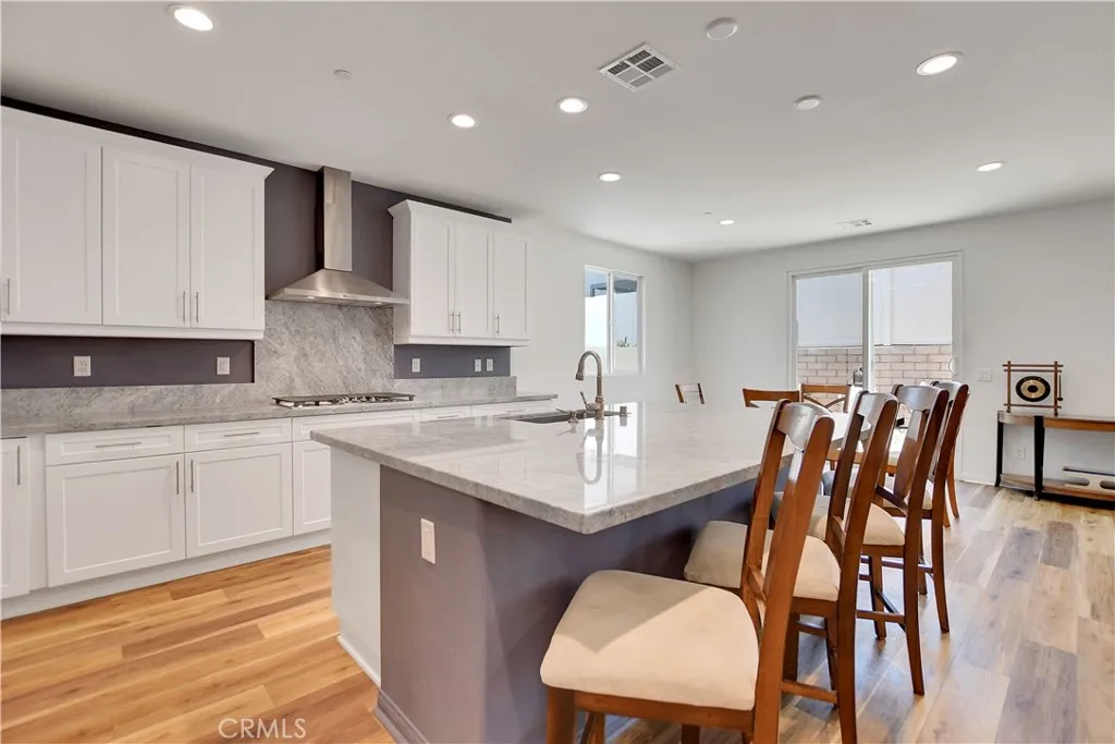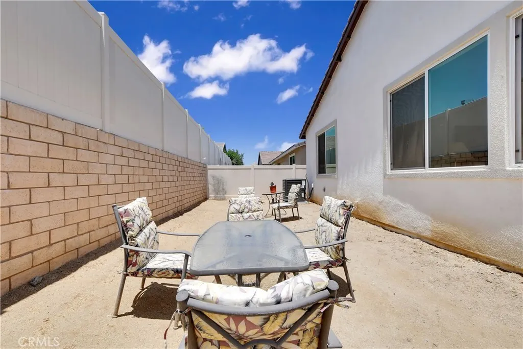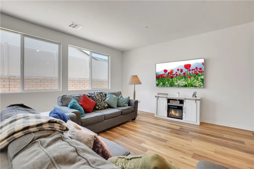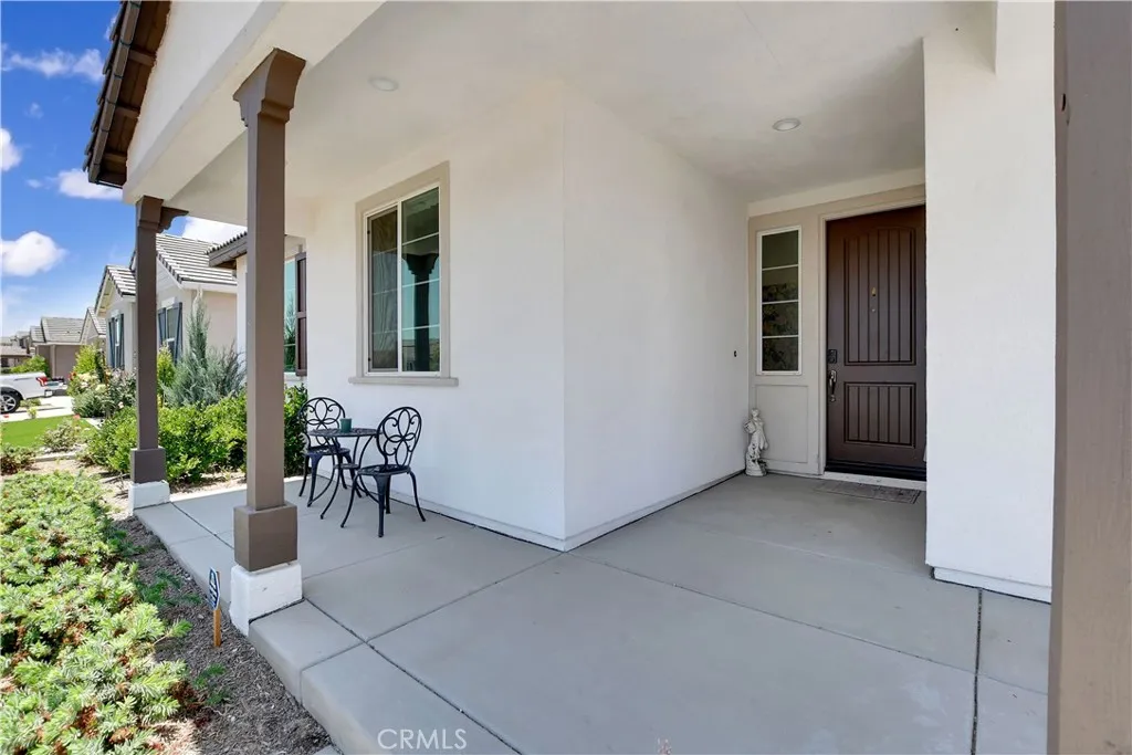 This beautiful single story Menifee home, built in 2023, offers 2615 square feet of living space with four bedrooms, three bathrooms, and a spacious two car garage, all situated on a 6098 square foot lot. Energy efficient paid off solar panels enhance this home, paired with a beautifully landscaped front yard featuring low maintenance greenery and a charming front porch with a sitting area that adds to its inviting curb appeal. Inside, the entryway welcomes you with laminate wood flooring that flow seamlessly throughout the house, a light color palette, and abundant natural light. To the right of the entry, a hallway leads to a full bathroom complete with a shower tub combo, a dual sink vanity and laminate flooring. Also down the hallway are three additional bedrooms, each featuring plush carpeting, ceiling fans, ample closet space, and windows that invite in warm, natural light. Back near the entry, you will find an additional full bathroom featuring laminate flooring, a shower tub combo, and a single sink vanity. Conveniently across the hall is a laundry room equipped with a wash sink, built in shelving and garage access. Relax in the open concept living room, featuring recessed lighting and large windows that flood the space with natural light, ideal for everyday comfort. The bright and spacious kitchen showcases stunning natural stone quartzite countertops, a walk in pantry, and stainless steel appliances including a five burner gas cooktop, built in oven, microwave, and dishwasher. It offers an abundance of cabinetry for ample storage, along with a large center island featuring a deep sink, matching granite surface, and bar seating for four. The dining area has recess lighting and a sliding glass door that floods the room with natural light and grants backyard access. Just beyond the living room, the large master suite includes plush carpet flooring, a window and a ceiling fan. The private en-suite bathroom offers a cohesive design with a matching tiled walk in shower and soaking tub. A dual sink vanity, linen closet and spacious walk in closet add both comfort and convenience. The backyard offers a spacious, blank canvas ready for your personal vision. Surrounded by a block wall and white vinyl fencing for added privacy, it's the perfect setting to design your ideal outdoor living space. This home is conveniently located near shopping centers, freeways, and highways, this home offers the perfect blend of comfort and accessibility.