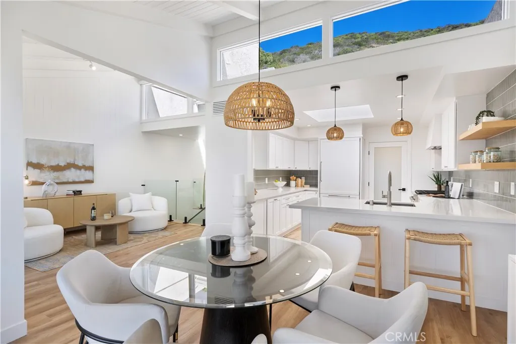 Must see!! A luxurious coastal retreat perfectly capturing the elegance and stye of upscale beach living. Completely remodeled and offering stunning panoramic views of the ocean, Catalina Island, white water, rocks, and sand from every room—a full sensory experience surrounded by the Pacific Ocean and Laguna's Greenbelt. One of Laguna's most serene locations! This spacious 2 bedroom, 3 bathroom condo has been thoughtfully reimagined with a blend of high-end finishes and comfortable design. The upper level welcomes you into a spacious light-filled living room with cathedral beamed ceilings, painted tongue and groove walls, a cozy gas fireplace finished with ceramic tile and a wood mantel, and warm wood-like vinyl floors. The open floor plan draws you past the living room to the captivating views, leading you to a cozy den that opens to a deck—ideal for relaxing, socializing, and enjoying the ocean breezes. The kitchen is a dream, featuring all-new stainless steel Thermador appliances, a six-burner stove, custom cabinetry and a breakfast bar that invites conversation over coffee. The deep green tile backsplash and open wood shelves add a touch of natural elegance, while the wine fridge and walk-in pantry ensure you're ready for any gathering. Adjacent to the kitchen, the dining room offers front-row views, creating the perfect setting to gather with family and friends. Glass handrails elegantly frame the stairs and decks, enhancing the open and light filled rooms. The lower level includes a primary suite with a private deck, a desk area with built-ins, a walk-in closet, a separate soaking tub, walk-in shower, and dual sinks. The second bedroom offers a deck with views and a large closet. This level also includes a laundry room with new full-size LG washer and dryer, a second bathroom with a walk-in shower, and a large storage closet. This highly-desired community features an elevator to all levels, including the parking garage, where you'll find a dedicated space and storage. Proximity to the elevator is also a big bonus for this condo, as well as a heated community pool, sun deck, and outdoor shower. Just steps from the Montage Resort, beautiful beaches, popular Laguna restaurants, a shopping center, 2 parks, Laguna Trolley stops and more!. Don't miss out on the opportunity to own a piece of luxurious Souther California living in Laguna Beach. Live the sophisticated beach life with a blend of style and serenity in this stunning coastal home.