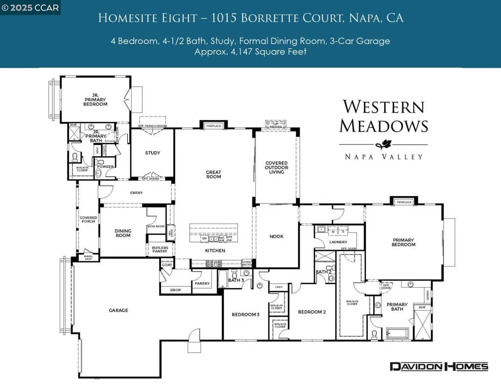 PRICE REDUCTION! INCREDIBLE VALUE! MOVE IN READY WITH QUICK COE! Welcome to Napa’s newest premier address, Western Meadows by Davidon Homes- a limited edition of new luxury homes in a private GATED community. This magnificent farmhouse style home is now ready for QUICK MOVE IN! At approximately 4,147 square feet, this home is generously sized with four bedrooms, four and one-half baths and a 4-car garage. The elegant primary suite is complete with a romantic fireplace, generously sized walk-in closets with custom closet system, and serene spa-like bath with glass enclosed shower, dual vanities and 6’ soaking tub. Enjoy grand scale entertaining in the formal dining room as well as quiet family nights and casual gatherings in the inviting great room with fireplace, epicurean kitchen, and sliding doors to the indoor/outdoor living area. Western Meadows is surrounded by quiet, established neighborhoods just minutes from Hwy 29, downtown Napa, and the area’s world-renowned wineries, fine dining, spas and resorts, and championship golf courses.