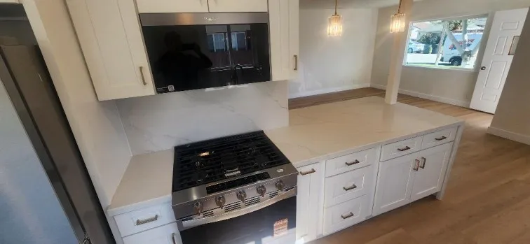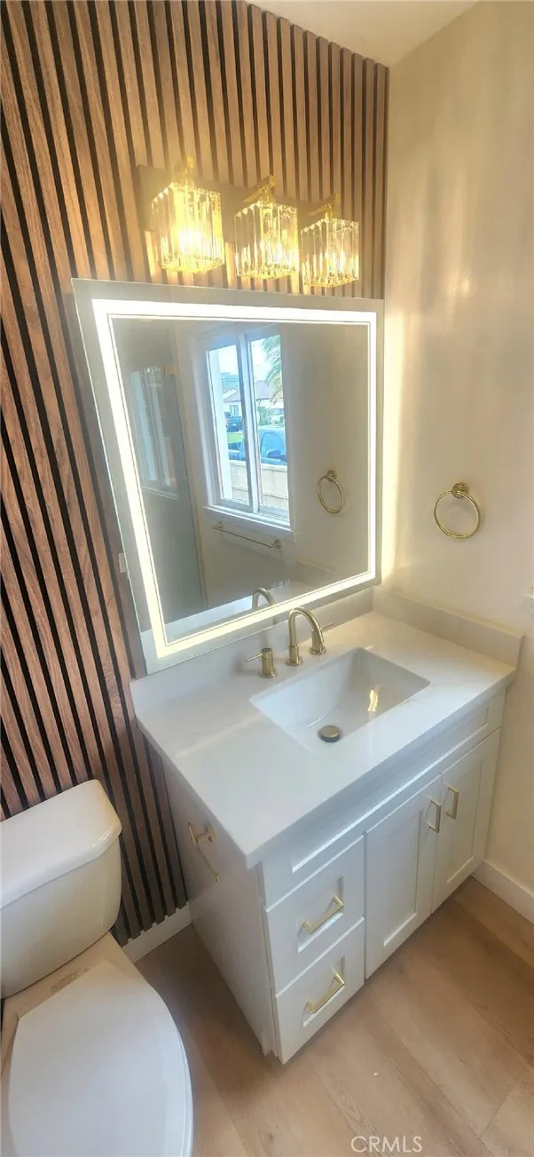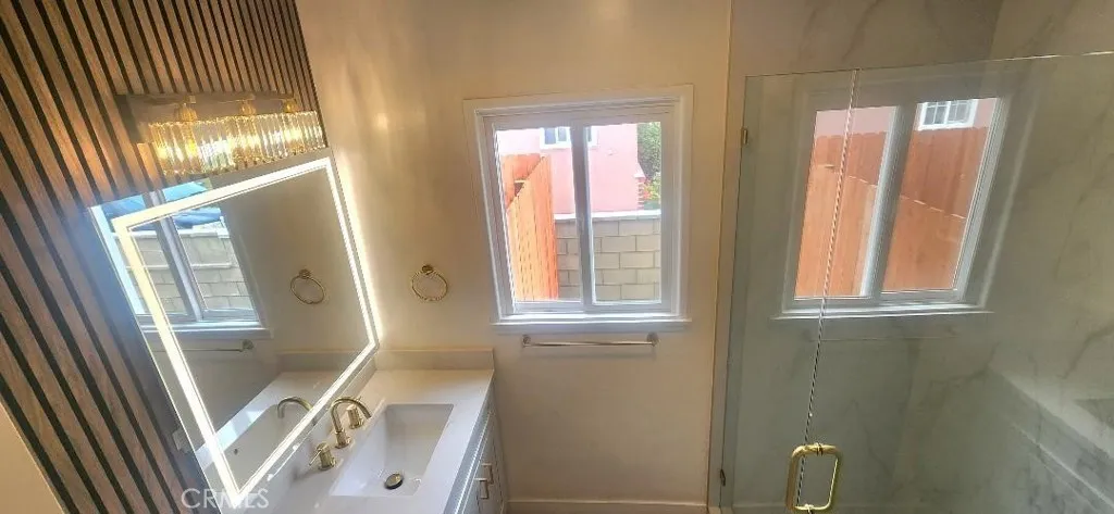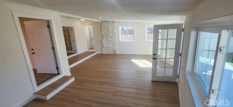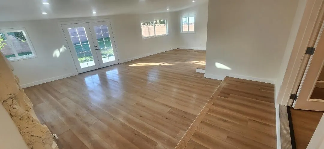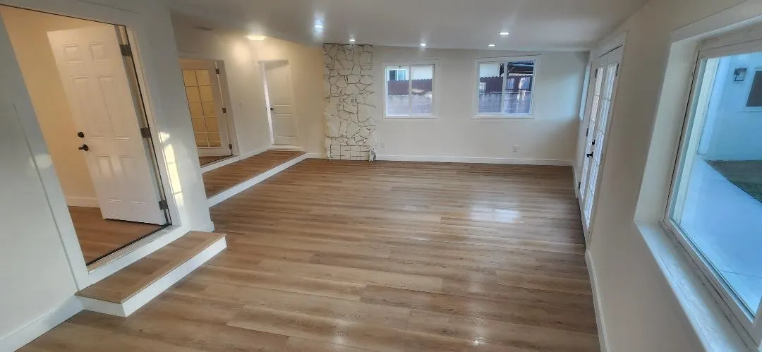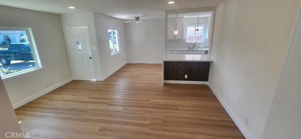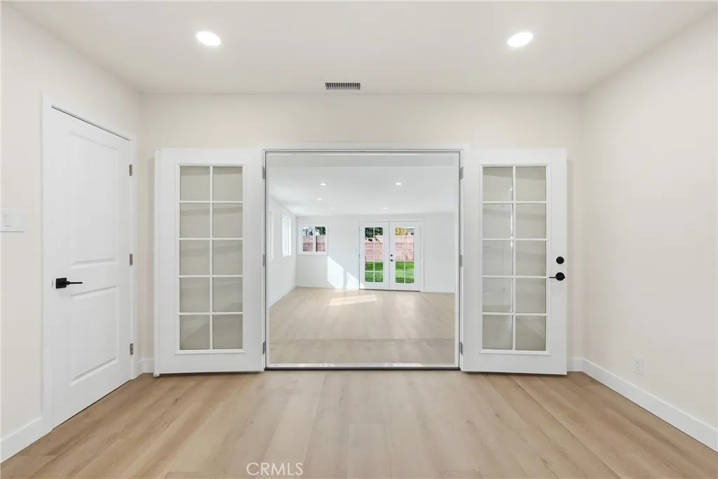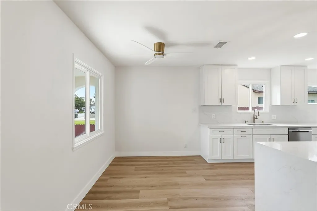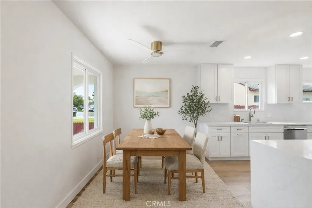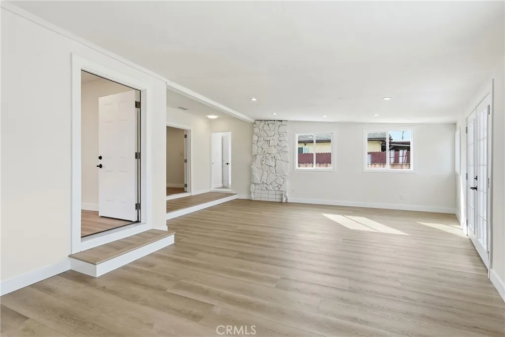 Garden Grove Remodeled Detached Single Level 3 Bedrooms / 1.5 Bath Home close to Disneyland . Remodeled Throughout with ; New Hardwood Style Vinyl Plank Flooring , Freshly Painted in two tone White interior & exterior , Open kitchen has New Stainless Whirlpool appliances ( slide in gas range oven stove , dishwasher , microwave , double door refrigerator with ice maker & water dispenser ) / New White Quartz counters with Backsplashes up to the Upper cabinets / New solid wood White Shaker Cabinetry with Spice Rack pull out , Soft Close features / Bar Area has Pendant Lights & Wood Paneling , Dining Area has a new Ceiling Fan , Stunning Bath has a New Walk in Tiled shower with Frameless Shower Door / Wood Paneling / New LED mirror with light , Recessed lighting throughout , Vinyl windows and new French Doors , New Central ac & heat , new raised panel interior doors and moldings , detached double garage , Close to Disneyland & Convention Center . Square footage includes unpermitted rear addition that can be used as a sun room or bonus room , sun room size is aprx 430 to 520 sq ft / sq ft on legal is around 1100 , city has documents on the addition / see supplements , Laundry room has full size hook ups , New Landscaping with automatic sprinklers