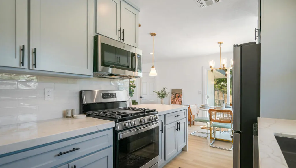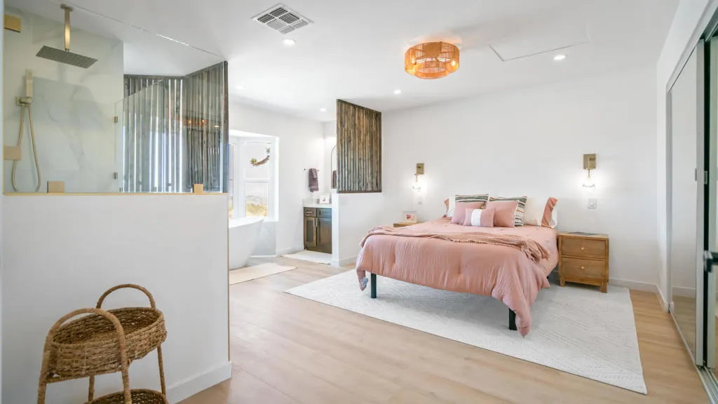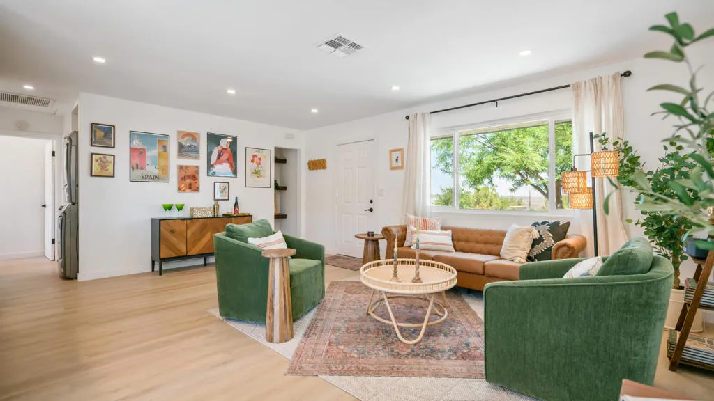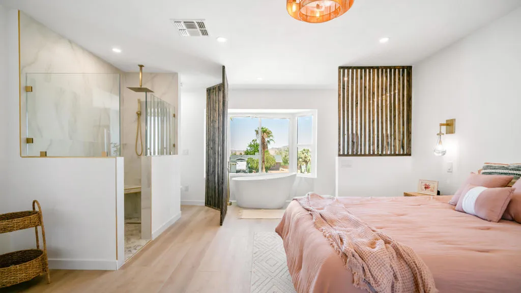 MAJOR PRICE IMPROVEMENT 34,000K DISCOUNT for quick sale to prequalified buyer. A Desert Sanctuary. Completely remodeled from top to bottom with luxurious finishes. Modern design meets soul-deep serenity in the heart of Upper Friendly Hills--just minutes from Joshua Tree National Park and minutes from downtown. Mountain views from every window.This 3BD/2BA desert retreat was crafted for those who crave more than a house--they want a lifestyle. Imagine starting your day with a sunrise meditation on the raised circular deck, wrapping up a work call while gazing at endless desert skies, or gathering with loved ones under a canopy of stars.Inside, you'll find a chef's kitchen with quartz waterfall counters, subway tile backsplash, and open flow into the living space--perfect for connecting over meals or creating content for your next Airbnb guest experience. The spa-inspired primary suite offers a soaking tub, walk-in shower, and custom desert-view window--a private oasis to recharge your energy and mindset.The split floor plan offers privacy for guests, remote work, or a growing family, while the ficus-lined backyard and corrugated privacy fence create a tranquil retreat. Recent upgrades include a new roof, AC, recessed lights throughout, modern cabinets, wood wall features, smart thermostat, LVP flooring and indoor washer/dryer hookups, and natural gas connection for that dream fire-pit under the stars.Whether you're a remote worker seeking inspiration, an Airbnb host ready to wow guests, or a family wanting space to slow down and reconnect, this home offers the perfect balance of peace, possibility, and adventure.Your desert sanctuary awaits.