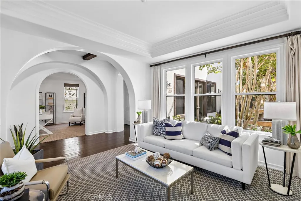 Step inside to a central hall plan featuring true hardwood flooring, elegant arched double doors, and an ideal blend of formal and informal living spaces. The living room and office flank the entry, while the formal dining room opens via French doors to an inviting enclosed courtyard—perfect for entertaining or quiet relaxation.