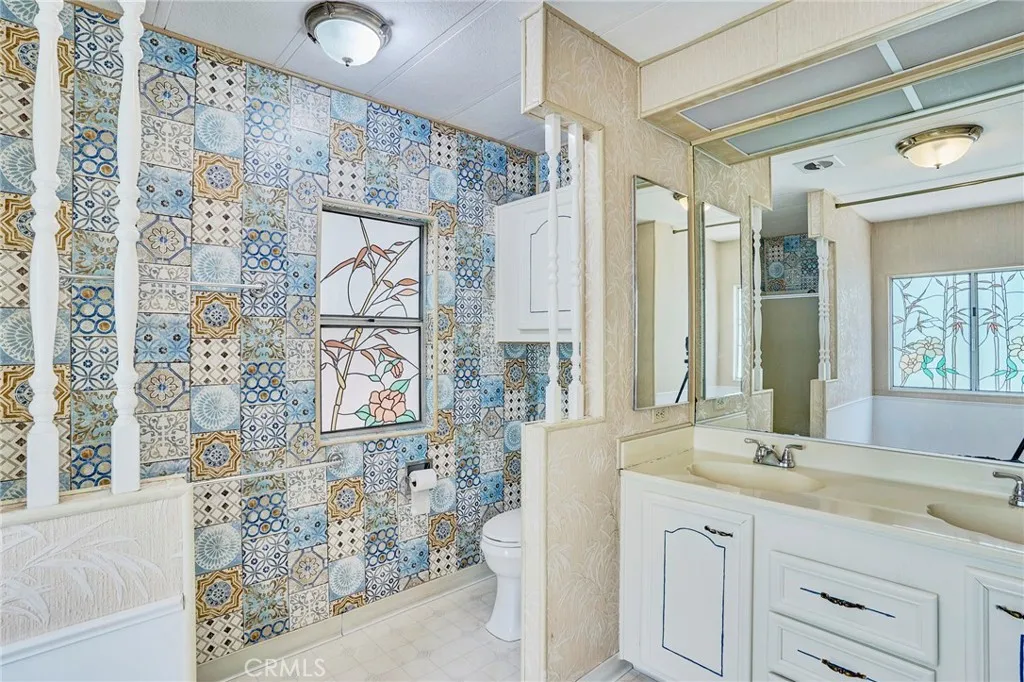 2074 sq ft, Triple-Wide Home, Quiet location across from the guest parking. One of the larger floor plans at the Prestigious Anaheim Shores Estates. This family park has large green belts and wider streets. The clubhouse amenities include a pool, spa, clubhouse with kitchen, card room, billiard room, multipurpose room, BBQ, and covered picnic area. The formal living room and formal dining room have beamed vaulted ceilings and a built-in China cabinet/hutch. The kitchen has lots of cabinets and counter space and is open to the formal dining room and family room. The family room has a slider to the patio. The master bedroom is huge with a double walk-in closet with mirror closet doors and another closet near the master bathroom. The AC/Furnace/oven, and roof have been replaced. Move-in condition. Centrally located to the 91 and 5 Freeways!