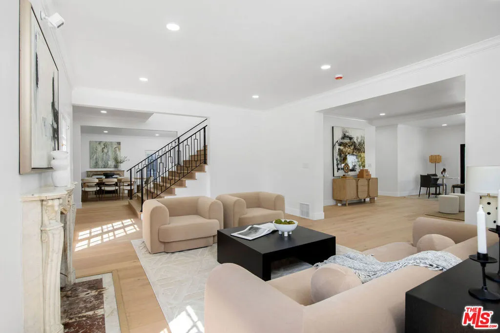 Romantic old-world charm meets modern luxury in this reimagined English Tudor, perfectly situated within Windsor Village HPOZ of Hancock Park. Behind manicured grounds and a majestic pine, the renovated interior unfolds with wide-plank oak floors, airy open-concept living spaces, and a statement staircase framed in black iron. The chef's kitchen features premium stainless steel Thermador appliances, while brand-new Panorama sliding doors connect the indoors to a true entertainers backyard with a covered patio, built-in BBQ, sink, fridge, and storage. Recent updates include new plumbing, electrical, ductwork, dual AC units, roof, paint, and paid for solar panels. The garage is recently finished with new doors, epoxy floors. The spa-inspired primary bath boasts a freestanding tub, porcelain shower with gold trim, and abundant natural light. Additional highlights include a wine cellar, decorative fireplaces, and an option for a sixth bedroom making this historic-meets-modern gem truly turn-key.