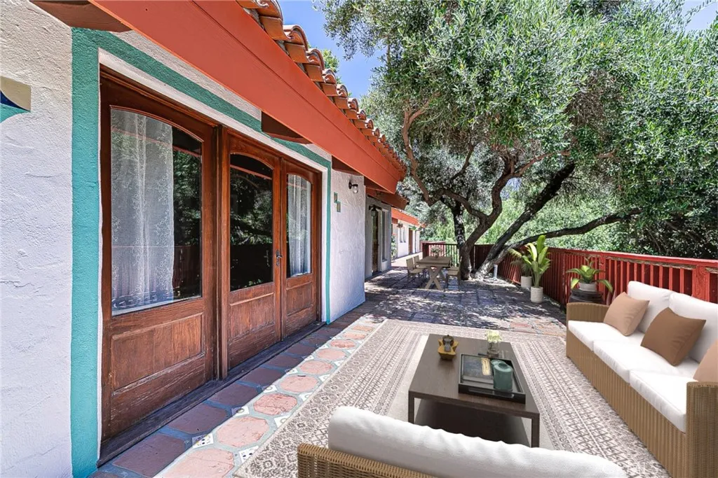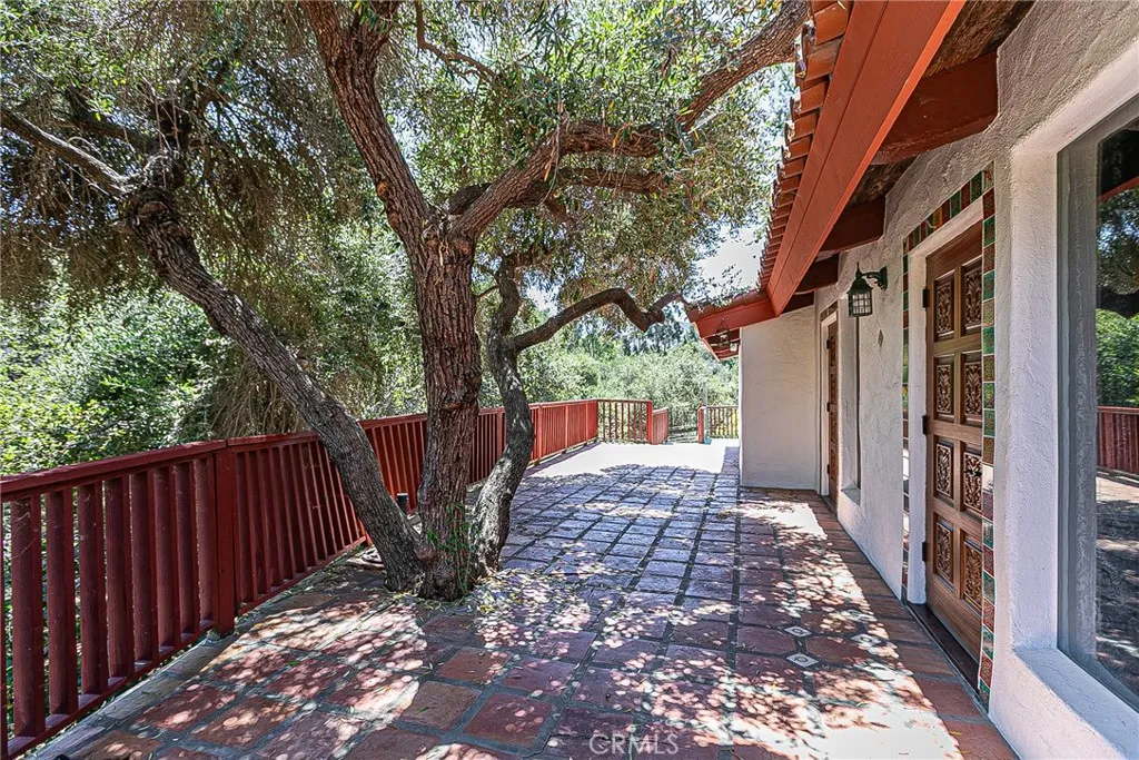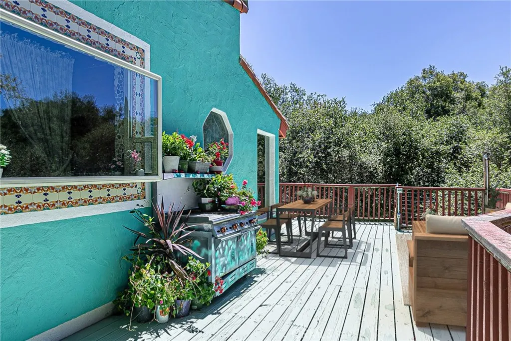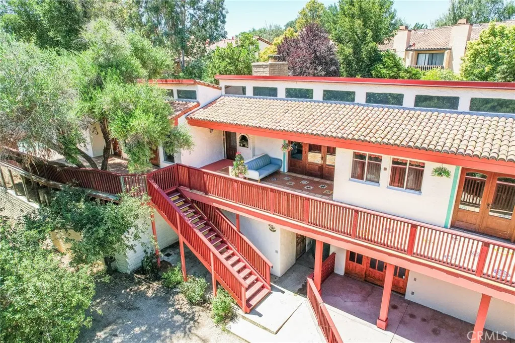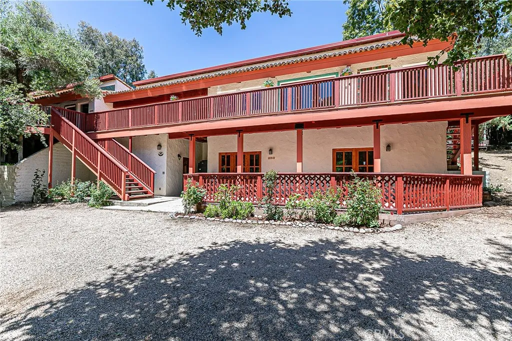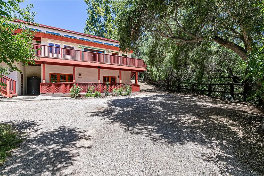 Discover a hidden hacienda nestled in the enchanting woods of Solvang, just moments away from restaurants, wine tasting, shops, parks & festivities. This colorful 2-story retreat is accessed via a private driveway, complete with your own bridge crossing your creek surrounded by a small forest of majestic oak trees. The living room boasts a cozy fireplace adorned with custom mantle & hearth. Experience the warmth of the beam ceilings made from wood sourced from a New Mexico mine, complemented by beautifully old-world textured walls. The custom kitchen is a chef's dream, featuring solid carved rosewood cabinets, brand-new Z Line 8-burner stove, & new dishwasher & a spacious walk-in refrigerator, accessed from the pantry & custom access doors in the kitchen. Enjoy the breakfast nook or take advantage of the formal dining room with space for a 12-foot table. The hacienda features 5 inviting bdrms, each with exterior door leading to an expansive deck. With 3.5 baths, this home is designed for comfort & convenience. Retreat to the primary suite, complete with wood-burning stove & a luxurious new jacuzzi tub. Downstairs, a recreation room, the 5th bedroom, a utility room & a wine cellar await your enjoyment. Additional amenities include a New Roof, New stackable washer & dryer & a 50-gallon gas water heater. This beautiful 1-acre lot is fenced for horses. Don't miss your chance to own this exceptional property; schedule a tour today & experience the magic yourself!