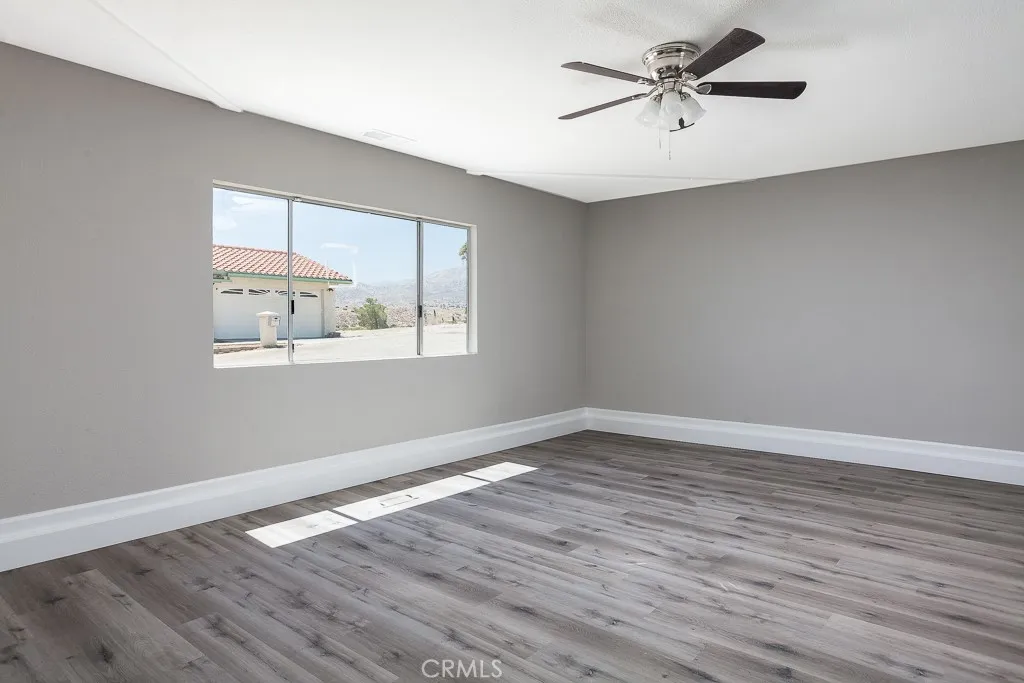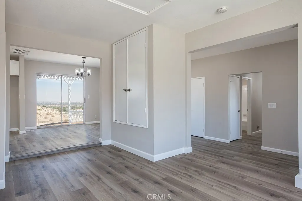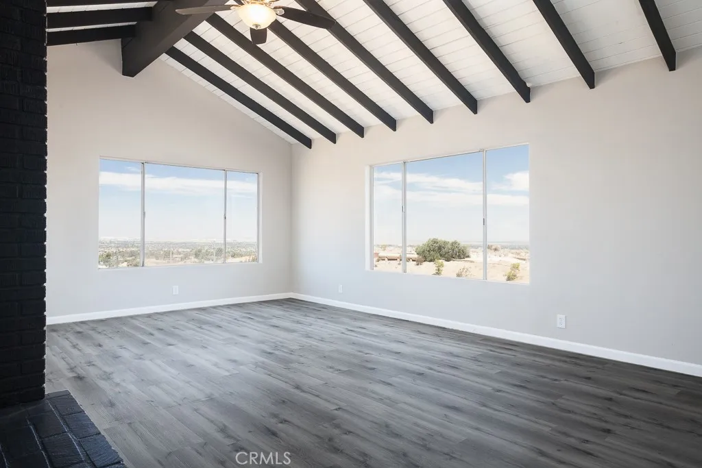 Freshly updated and move-in ready, this 3-bedroom, 2-bath home offers a rare opportunity to own a view property with a spacious 2,076 sq ft interior and nearly 3 acres of land. Situated on a quiet, private street, the home is anchored by a striking second living room with vaulted ceilings, a dramatic brick fireplace, and wall-to-wall windows that frame panoramic canyon and city views. The kitchen has been tastefully updated with white shaker cabinets, quartz countertops, stainless steel appliances, and new flooring. The layout offers both utility and flow, with the entry opening to a spacious front living room. Toward the rear of the home, the kitchen and formal dining room connect seamlessly to the show-stopping second living area. Down the hall are three generously sized bedrooms and two full baths. The primary suite features an ensuite bathroom. The private hillside setting—with sweeping vistas that stretch for miles—is composed of two separate parcels, both included in the sale - rare and scenic retreat.