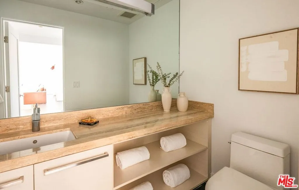 Perched on the top floor of this iconic architectural gem designed by Zoltan Pali, FAIA. This sophisticated Penthouse conveys urban elegance and the coveted California lifestyle with an open concept floor plan, soaring ceilings, sleek wood floors and expansive walls of glass that open seamlessly onto a sprawling patio. Framed by lush meticulously designed landscaping, the patio offers stunning hilltop views, perfect for both relaxation and entertaining. The chef-inspired kitchen, complete with a breakfast bar, is ideal for hosting gatherings or enjoying casual meals. Two generously sized master suites each feature their own private patios, luxurious en-suite bathrooms, and walk-in closets, providing a perfect blend of comfort and privacy. Additional amenities include side-by-side parking, a private storage room, and in-unit laundry for ultimate convenience. Located steps from Melrose Place in the vibrant heart of West Hollywood, this Penthouse is a rare opportunity to experience elevated living in LA's most desirable neighborhood.