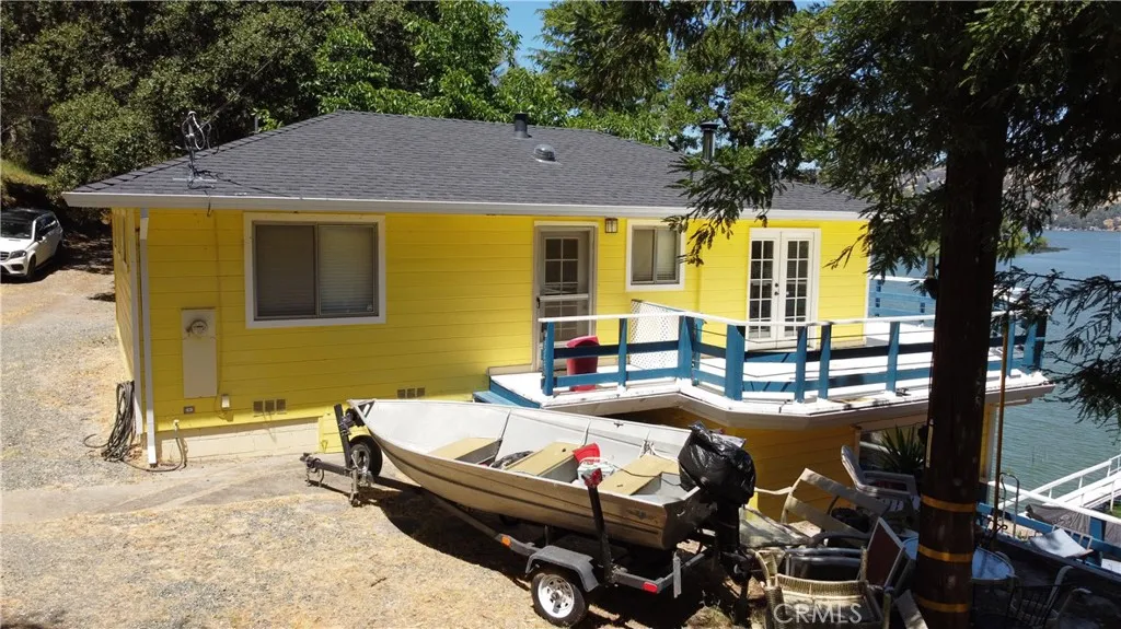 LAKEFRONT WITH TWO HOMES Five bedroom, two bath main home, one bedroom, one bath guest house. Covered dock, boat slip with winch, 100 ft water frontage on a deep water cove with no neighbor on one side. Perfect family-sized vacation getaway or permanent home, with potential for income with separate guest home for either short or long term. Laminate flooring, tile baths, custom concrete counter tops. Wood stove with natural stone backdrop. Family room for games and movies. Wrap around decks opening off the living room, including an outdoor deck bar to take in the spectacular natural location with total seclusion and quiet. This is the place where you can really let go, on your own, or with friends and family. Memories to be made here. Move in ready, wrap around decks. Brand new roofs on both homes. Catch fish from your own property, or easily get out on the water and explore California's largest natural lake within its borders.