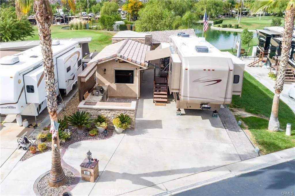 WOW!! This is the one... This lot has so much to offer, for sure a must see on your tour of the Resort. Let me start at the front of the lot, beautiful curb appeal with Palm Trees, Built in BBQ with storage and a Retractable Awning for extra protection or shade. Step inside through secure lockable doors to approx 750 sq ft buildout to a Full Kitchen w/ Granite Counters, Residential Stainless Steel Frig, Stove and oven. So much counter space & storage for your stuff that you need to cook and clean, moving out of the kitchen into the Dining & Family Room area all Stained Stamped Concrete looking out onto the Golf Course & Pond thru Double Screens for privacy and protection from the elements. There is a patio to watch the Golfers and take in the Sunset with the protection of a Retractable Awning and a Fire Pit for warmth and comfort. One last area to enjoy is the entertainers area with an Island with two small frigs for wine, sodas and beer, this area even has a sink for extra cleaning and fun. Next to this is the Washer and Dryer tucked away and only seen when needed. Included in Rancho California RV Resort is a 14 hole Executive Golf Course that is free for owners, 5 Pools and Jacuzzi areas, Tennis Courts, Pickle Ball Courts, Laundry Rooms, Dog Park, Horse Shoe Lawn, Club House, Hiking Trails, all inside Gated Community that is Guarded 24/7. You can live here or rent your space. Peace and quiet serenity all just 25 minutes from Temecula Wine Country. No age restrictions. Financing Available....