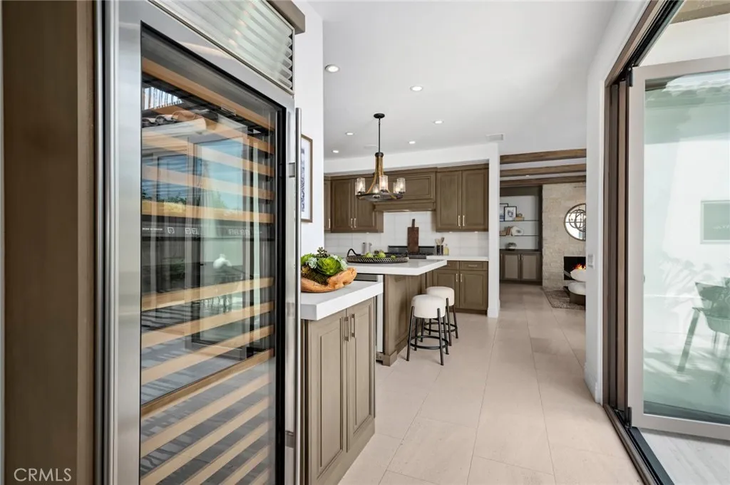 The modern kitchen, with high-end appliances and a spacious island, flows into a welcoming family room with a fireplace and adjacent breakfast patio, ideal for gatherings or quiet mornings.