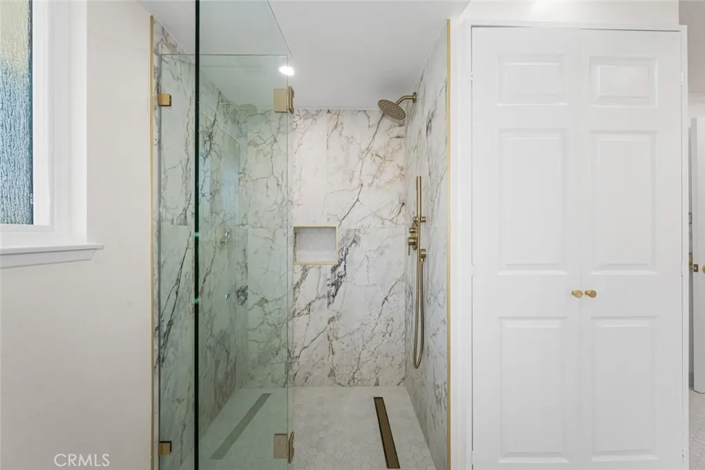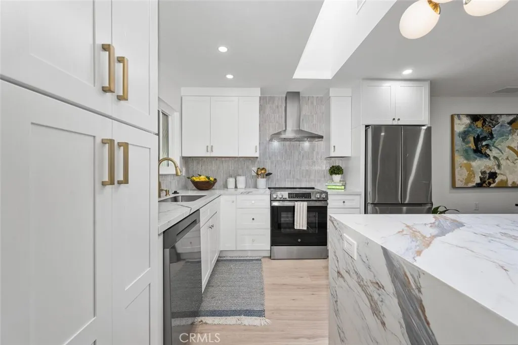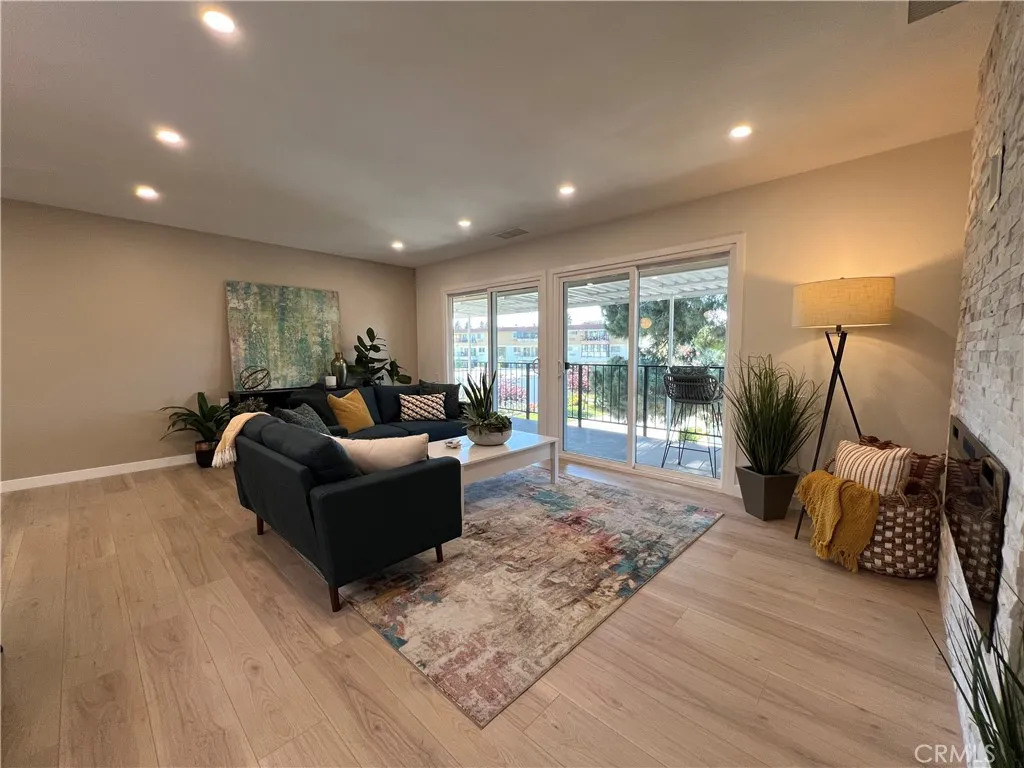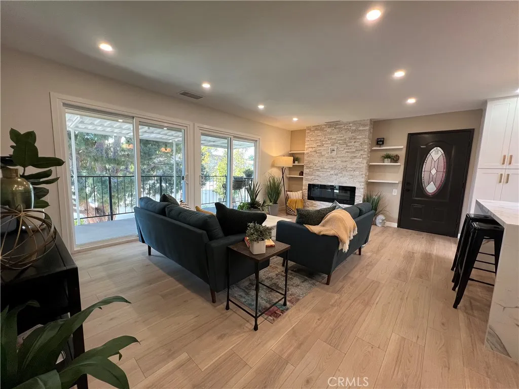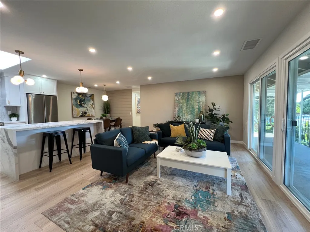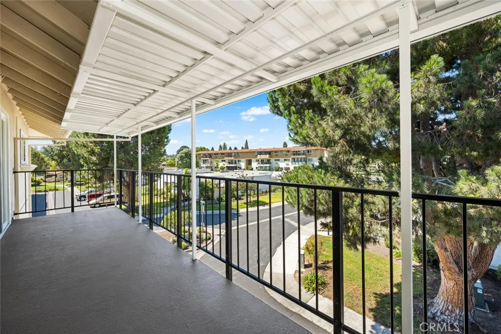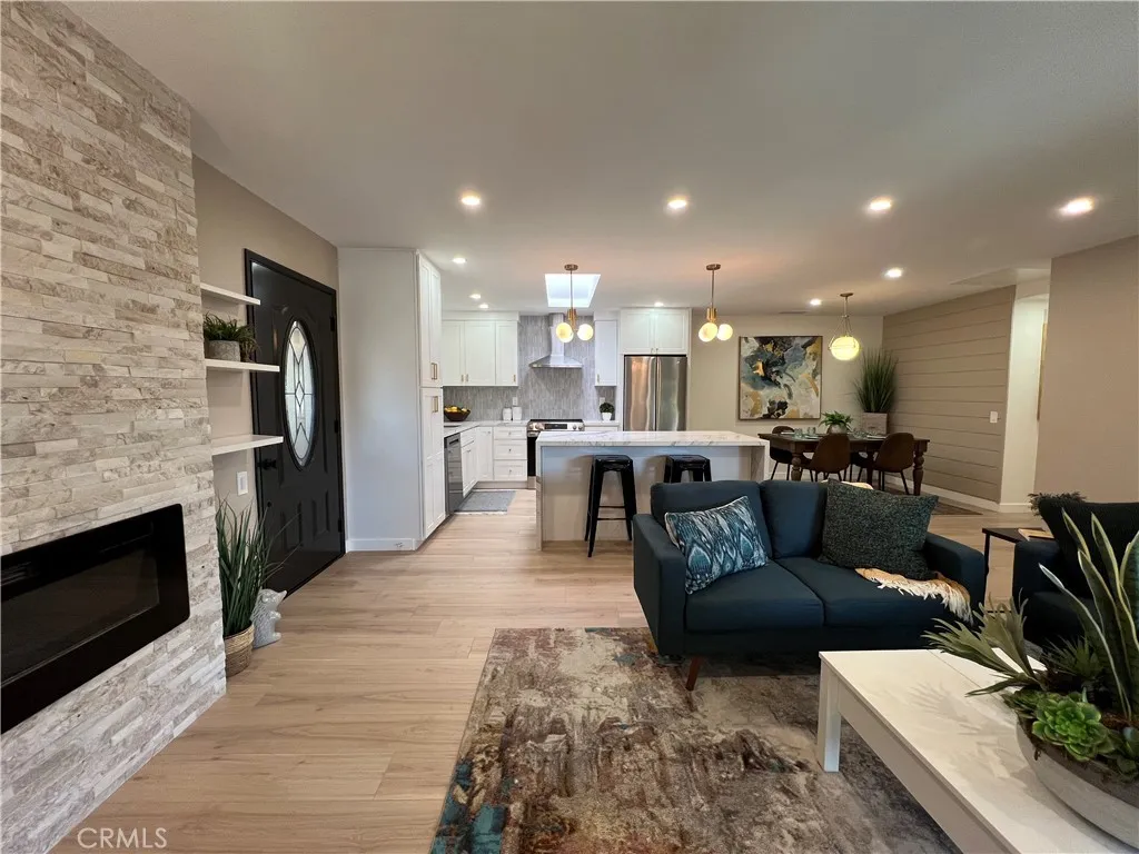 BRAND NEW CONSTRUCTION! Welcome to this beautifully reimagined top-floor Casa Contenta model, ideally situated in the sought-after Third Mutual of Laguna Woods. Step inside to an inviting open-concept living space enhanced by recessed lighting and a custom floor-to-ceiling stone electric fireplace that creates a stunning focal point. Expansive dual-pane sliding doors seamlessly blend indoor and outdoor living, offering a peaceful, treehouse-like setting with exceptional privacy and no visible neighbors. A dramatic skylight stretches across the kitchen, filling the home with abundant natural light. The kitchen is thoughtfully redesigned with sleek quartz countertops, stainless steel appliances, Shaker-style cabinetry, pendant lighting, and an oversized island with a breakfast bar—perfect for entertaining. Just off the kitchen, a dedicated dining area is highlighted by stylish custom lighting, ideal for both casual meals and gatherings. Down the hallway, the guest bathroom has been tastefully updated with a new vanity, a fully tiled roll-in shower, and a glass enclosure. The unique layout features a private primary suite with a bright, modern bathroom showcasing quartz countertops, tiled flooring, and a low-threshold glass-enclosed shower. Additional features include high-quality laminate flooring throughout, central air conditioning, and the convenience of an in-unit washer and dryer. This home is ideally situated within Laguna Woods, allowing residents to take full advantage of its amenities. Laguna Woods Village residents are privileged to enjoy a 27-hole championship golf course, a 9-hole executive par 3 course, pickleball and tennis courts, lawn bowling, gyms, clubhouses, swimming pools, horse stables, gardening centers, an art studio, a world-class wood shop, computer workrooms and classes + over 200 clubs and organizations!