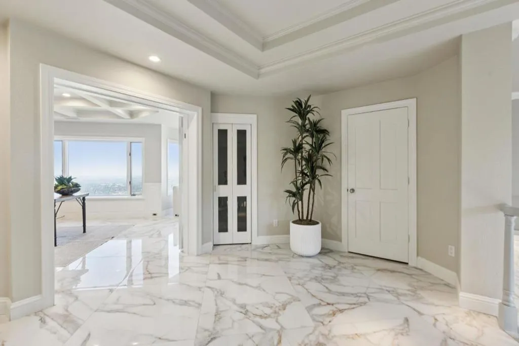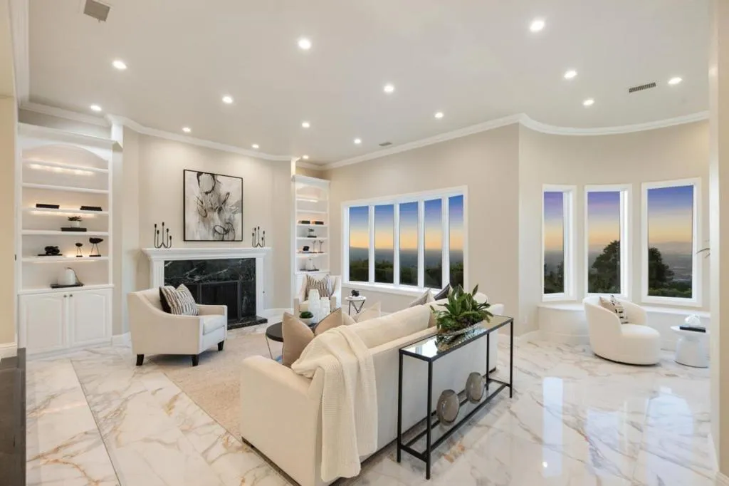Set along one of Los Gatos most sought after ridge lines, this extraordinary estate captures sweeping yet intimate panoramas. Nearly every window frames views across downtown Los Gatos, Vasona Lake, the surrounding mountain ridges, and even the distant skylines of San Francisco, Oakland, and San Jose. Wrapped in privacy and framed by elegant landscaping, this breathtaking residence combines grandeur, comfort, and a deep connection to its natural setting. A tall wrought-iron entry door accented by mosaic glass opens to a grand foyer with volume ceilings and an elegant chandelier. Dual staircases sweep upward, creating balance and presence, while large windows allow natural light to pour in. Radiant heated marble and tile floors flow throughout the property for year-round comfort. The home unfolds with thoughtful flow and scale. With an expansive primary suite, four guest bedrooms, executive office, attached ADU with full kitchen and bath, detached pool house and two finished three-car garages, this estate is a home of scale, refinement, and enduring presence. With panoramic views dusk to dawn, an elegant design and resort-style amenities, it offers a true Los Gatos estate experience private, expansive, memorable, and a wonderful place to call home.
