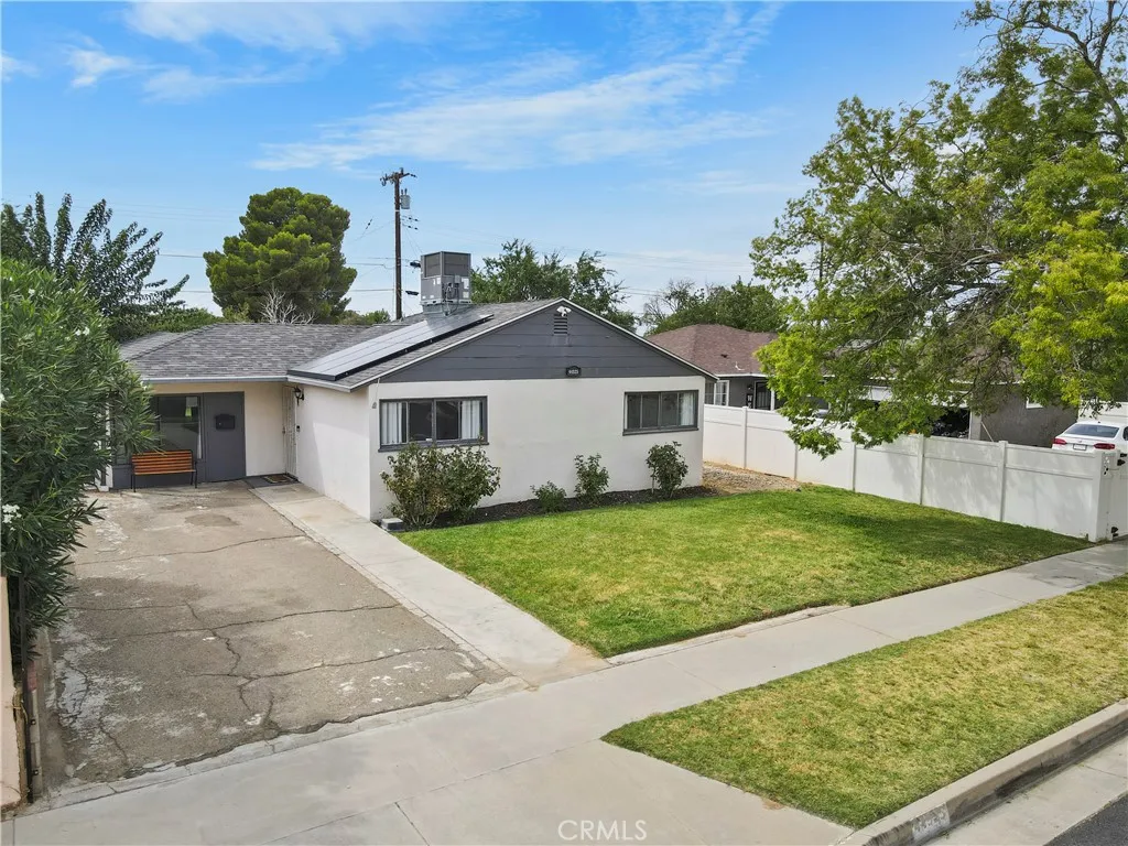 Welcome to this beautifully upgraded 3-bedroom, 1-bath home, featuring 1,184 sq ft of living space. Situated on a 5,921 sq ft lot with lush green lawns, this property offers a fantastic outdoor lifestyle with a covered patio perfect for entertaining. Inside, you'll find a remodeled bathroom with a new shower, toilet, and stylish vinyl plank flooring. The kitchen has been enhanced with upgraded appliances, and a stackable washer and dryer are included. Recent improvements include a new HVAC system, water heater, copper plumbing, and roof, ensuring peace of mind. The solar system offers added energy efficiency and long-term savings. This move-in-ready home combines modern comfort with timeless charm.