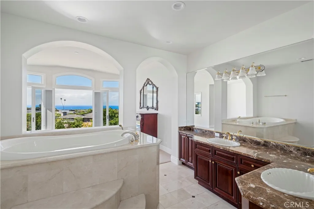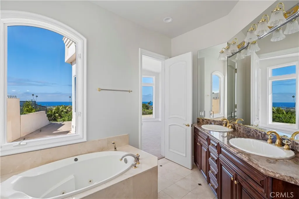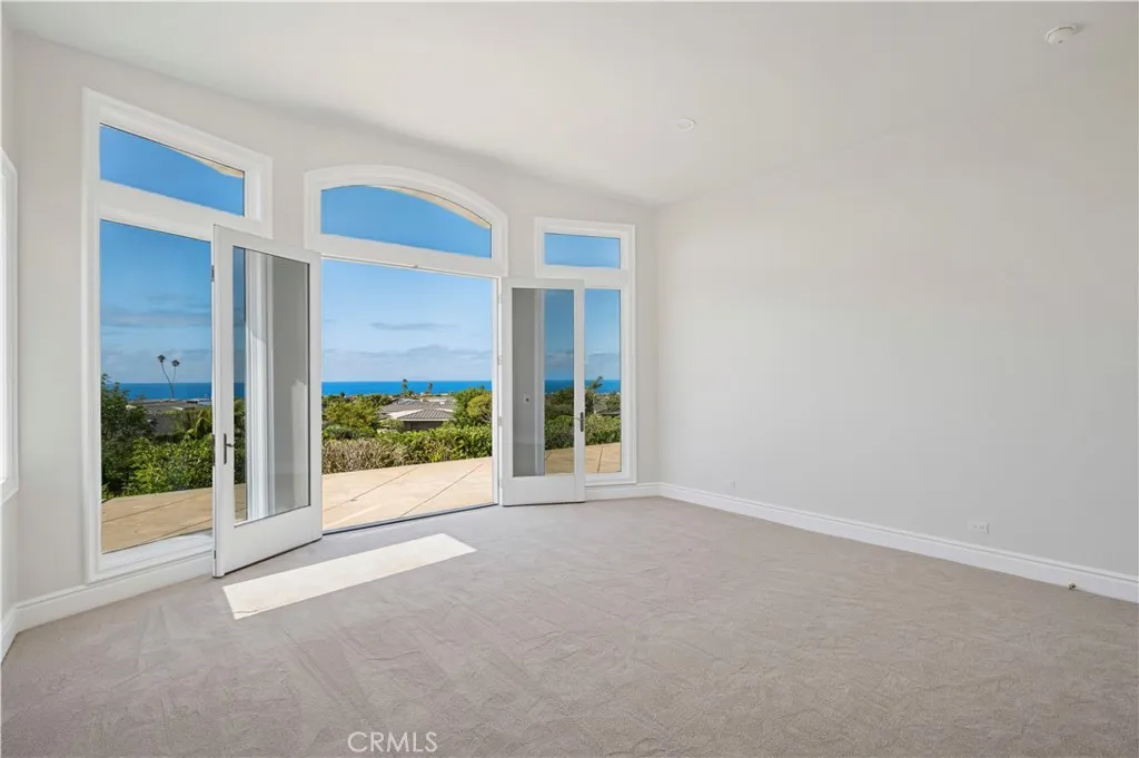 Grandeur meets coastal elegance at this gated estate, introduced by a stately fountain and dramatic entry. Inside, soaring ceilings frame breathtaking ocean views from nearly every room. Designed for entertaining, the expansive chef’s kitchen showcases granite counters, a six-burner Viking range with griddle, SubZero refrigerator, Gaggenau induction cooktop, microwave, dishwasher, prepping sink, and a spacious layout overlooking the dining area and wet bar with custom shelving, wine storage, and sprawling counters. The formal family room with fireplace and French doors offers a warm yet private retreat. Two luxurious primary suites sit at the forefront of the view, each with walk-in closets and spa-inspired bathrooms featuring jetted tubs, walk-in showers, dual vanities, private water closets, and abundant storage. Two additional ensuite bedrooms plus a mirrored gym with mobile barre functionality provide versatility and comfort. Additional features include a private laundry room, a finished 3-car garage, and a sprawling rear yard showcasing panoramic sparkling water views.