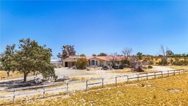 INVESTOR OPPORTUNITY! This 3 bedroom, 2 bath single-family home boast over 2,600 sqft, plus a 2 bedroom, 1 bath small home, both are fixer uppers with potential, invites the discerning eye of property enthusiasts and creative real estate minds. Spaciouse entry into living room with lots of natural light with marble floors throughout. The kitchen, though in need of renovation, offers ample counter space and potential for stain-steel appliances, creating a culinary haven. Family room has a fireplace and vaulted ceilings. Fenced back yard spaces with RV storage, horse riding rink with spectator booth and stables with a 1 bedroom 1 bath caretakers' unit inside. This fixer upper beckons the right buyer to envision the possibilities and create a truly one-of-kind Desert Oasis.