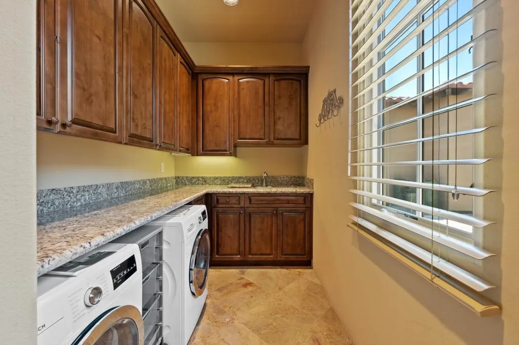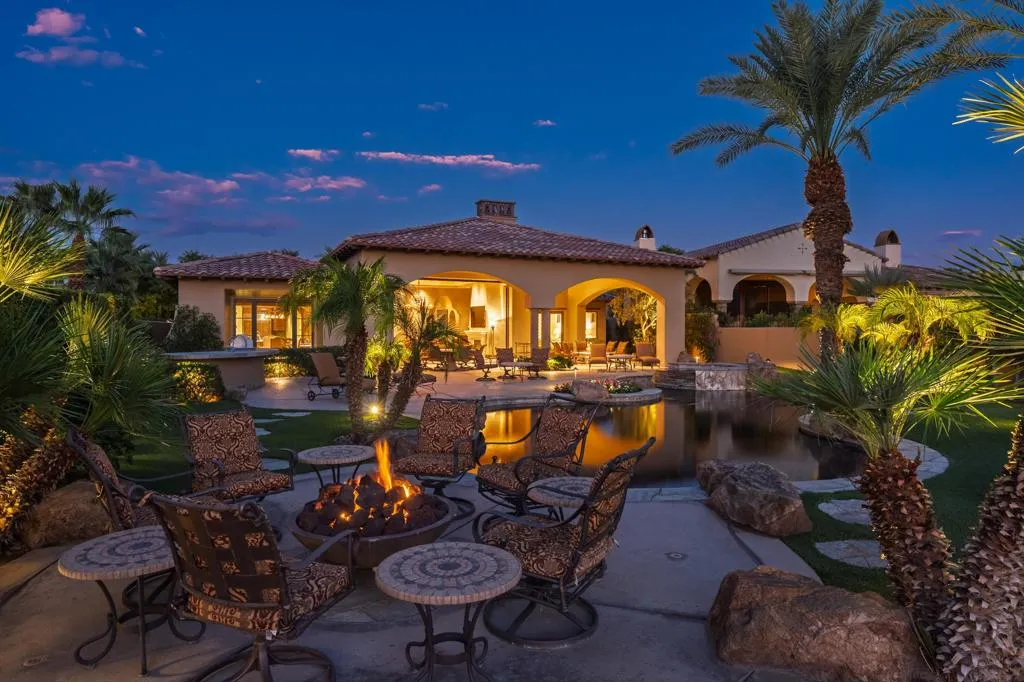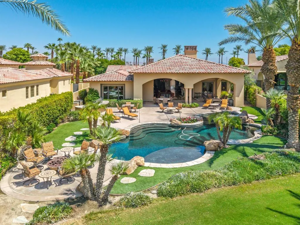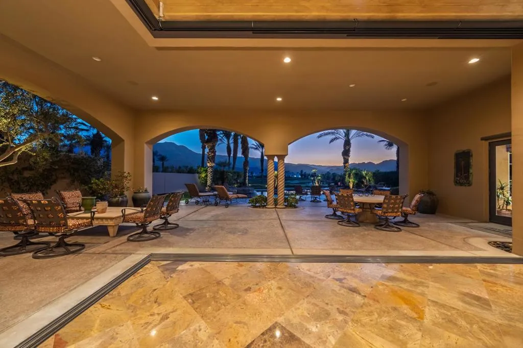 Elevated above the 4th green, this residence captures sweeping South-West views of the Rees Jones designed course, shimmering lake, and the majestic Santa Rosa and Coral Mountains. Step inside to an open floor plan highlighted by elegant travertine floors, crown molding, recessed lighting, and expansive motorized walls of glass that disappear with the push of a button, creating seamless indoor/outdoor living. The gourmet kitchen is equipped with upgraded cabinetry, Wolf/Sub-Zero appliances, two dishwashers, a wet bar, and a morning room that takes in the spectacular views. A temperature-controlled wine room adds the perfect touch for wine enthusiasts, while a dedicated office provides a quiet retreat for work or study. The luxurious primary suite features a cozy fireplace and a spa-inspired bathroom with direct patio access. Guests will enjoy the detached casita, complete with a fireplace in the living room, bedroom, bathroom, and kitchenette. The backyard is a true entertainer's dream, boasting a custom pool and spa, an outdoor kitchen with BBQ, smoker, and bar seating, plus a fire pit to gather around on cool desert nights. A large side yard with a private horseshoe court completes this exceptional outdoor living experience. Come live the life you've always imagined!