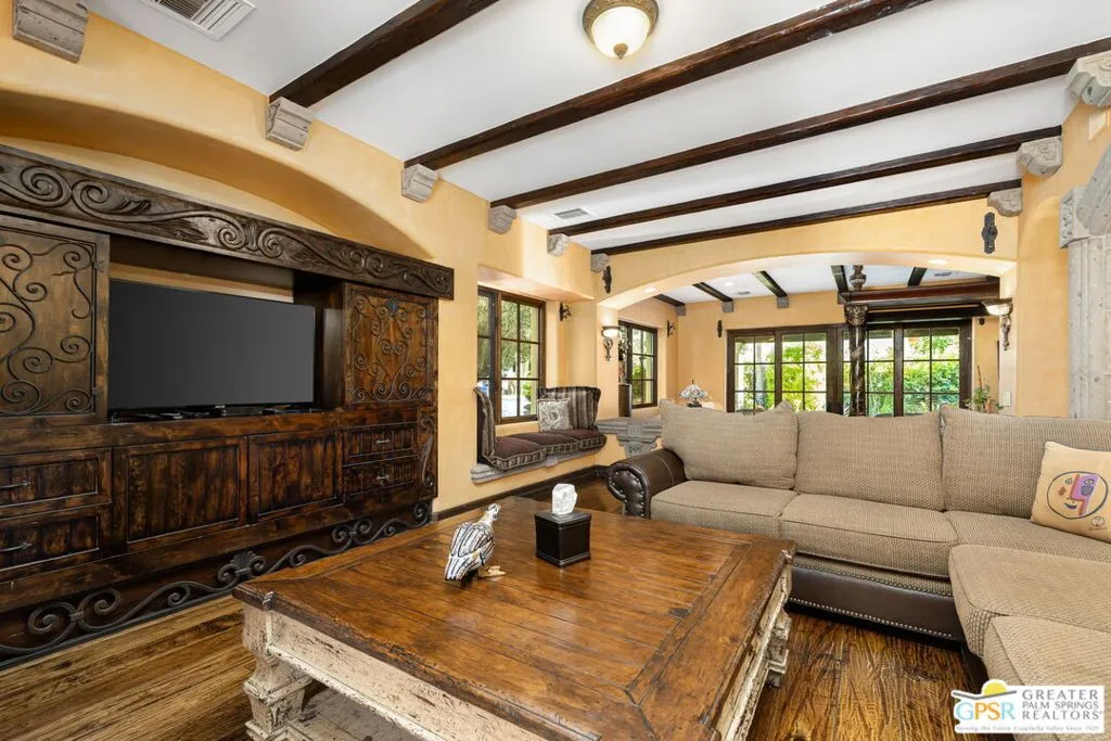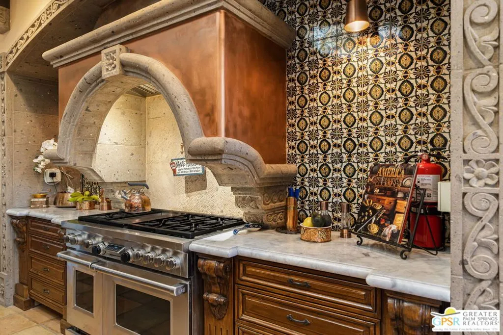 Seller would Consider Lease Option. "La Belle Dame" is a masterpiece by Juan Carlos Ochoa in Clancy Lane Estates. In the heart of Rancho Mirage's most coveted enclave, this gated, one-acre Mediterranean-inspired estate by celebrated architect Juan Carlos Ochoa is a singular work of art, uniting Old-World craftsmanship with resort-caliber amenities. Restored inside and out, the 6,424 sq. ft. single-level villa offers an unparalleled blend of architectural integrity, privacy, and timeless luxury. Pass through custom wrought iron gates into a secluded world where mature cactus gardens, an olive tree grove, and mountain views set the tone for the extraordinary. At the center of a sweeping motor court, a 10-foot hand-carved Cantera stone fountain commands attention. Two separate garages, one attached that is climate controlled, one detached, offer parking for four, with additional guest parking for six. Every detail speaks to Ochoa's signature craftsmanship: Mexican Saltillo tile and hand-hewn oak plank floors, vaulted ceilings with exposed beams, arched passageways, bullnose corners, and hand-carved stone fireplaces. Custom Italian Albertini doors and cabinetry, Venetian plaster walls, intricate ironwork, and stone corbels are woven throughout the interiors, evoking the romance of a Spanish monastery while providing the comfort of modern living. The formal living room, anchored by a grand fireplace and wood-beamed ceilings flows seamlessly to the terrace through French doors. A spacious formal dining room leads to the chef's kitchen, crowned with a stained-glass illuminated ceiling, Wolf range, dual ovens, butler's pantry, Sub-Zero refrigeration, and a 200-bottle custom climate controlled wine cabinet. Multiple entertaining areas, both formal and casual, open to the outdoors, blurring the lines between interior elegance and exterior splendor. The primary wing is a sanctuary with dual walk-in closets, spa-inspired bath adorned with hand-painted Spanish tile, private den, and an executive office. Three additional ensuite bedrooms each offer distinctive character and luxurious finishes. A poolside cabana with half bath ensures guest comfort during long afternoons in the sun. The south-facing backyard mirrors a private resort, tiled swimming pool framed by gas fire bowls, spa in a stone grotto, four-sided stone firepit, and a pavilion with a fully equipped outdoor chef's kitchen. Multiple stone fountains, lush gardens, and intimate patios create a series of enchanting vignettes for entertaining or quiet reflection. Clancy Lane Estates is a gated, private sanctuary renowned for its exclusivity and proximity to world-class dining, shopping, golf, and cultural attractions. This home is more than a residence, it is a once-in-a-lifetime acquisition for the connoisseur of fine architecture and unmatched craftsmanship. This work of art is shown to qualified buyers by appointment only.