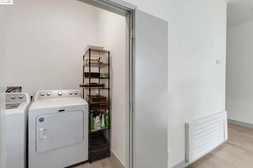 This move-in-ready contemporary condo is priced to sell and perfectly placed in the heart of Oakland’s vibrant Jack London Square. Inside, soaring eleven-foot cathedral ceilings, expansive custom sliding doors, and oversized windows flood the living area with natural light, creating a bright and welcoming atmosphere. The stylish kitchen features stainless steel appliances, a sleek backsplash, soft-closing cabinetry, and a peninsula island ideal for casual dining or gathering. Conveniently tucked next to the kitchen is your in-unit laundry, complete with room for shelving and extra storage. The bathroom feels like a private retreat with a floating vanity and spa-inspired tile shower. A private balcony provides the perfect spot for morning coffee or evening relaxation. The community rooftop deck includes seating areas, BBQ grills, and charming planter boxes. Parking is simple with your designated space in the secure, gated garage. All of this comes with unbeatable access to BART, the ferry, the farmers market, restaurants, parks, and Chinatown—delivering the ideal blend of comfort, convenience, and urban lifestyle. Views: Downtown