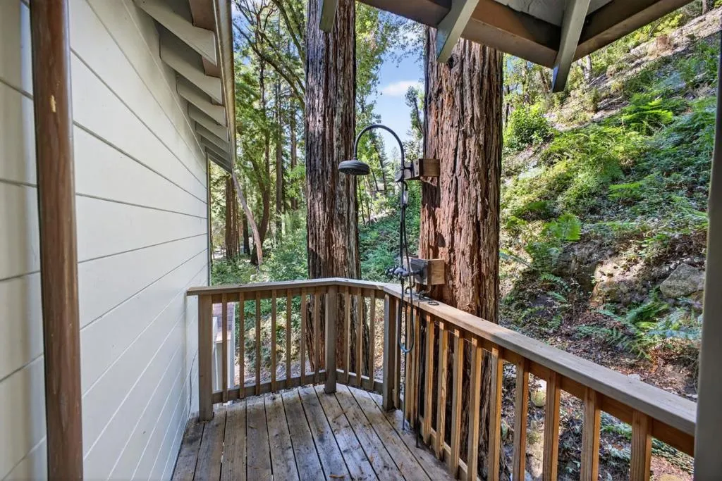 Welcome to your peaceful retreat in the historic Bracken Brae community where you can enjoy exclusive trails & river beach access. Situated on a private road & backing to greenbelt, this 3 parcel property feels secluded & quiet. The reverse floor plan elevates the main living spaces to capture light, ridge view & treetop privacy. This 3 bed, 2 bath home greets you with a livingroom featuring Brazilian cherry floors, a cozy fireplace with a woodburning insert & sweeping redwood views. The bright, thoughtfully designed kitchen showcases custom cabinets, quartz counters & a suite of Bosch appliances, opening into a sunroom where wall-to-wall windows bring the forest right to you. Step out onto the spacious deck perfect for entertaining or relaxing in fresh mountain air. Downstairs offers a private bedroom & bath plus a versatile bonus room ideal for an office, playroom or guest space. The houses flexible layout offers room to make it your own. Central heating system, exhaust fans & all appliances replaced in 2021. With oversized parking for a boat or RV, carport, 2 sheds & outdoor shower for after a river swim or muddy paws, this home blends everyday comfort with outdoor adventure. Just minutes from town & a short drive to Big Basin, its a true blend of home, nature & community.