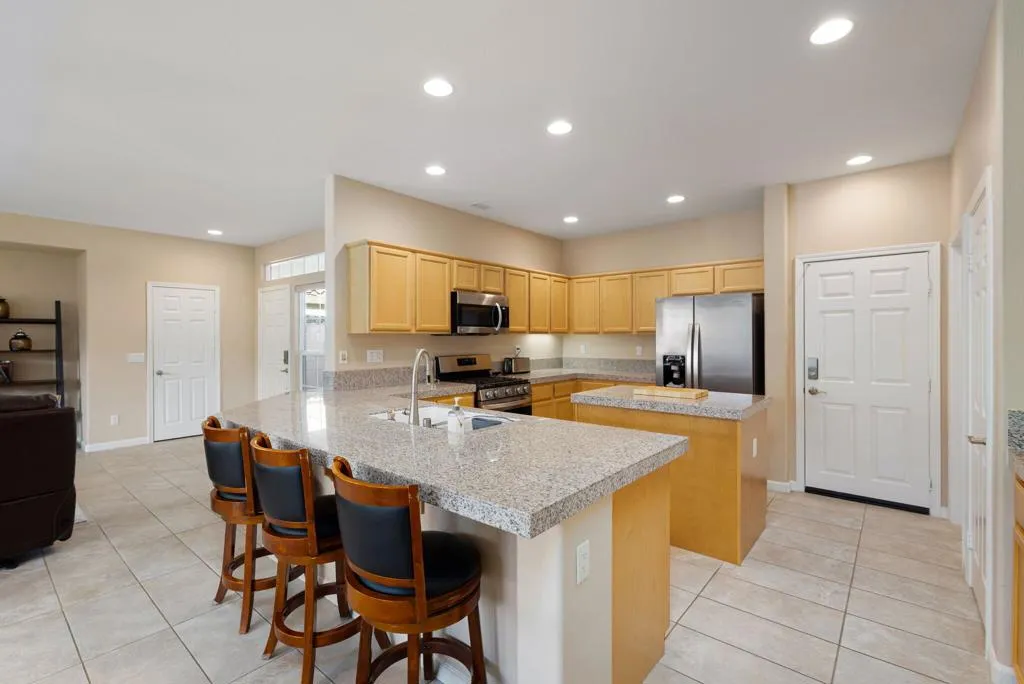 Experience the relaxed desert lifestyle at Trilogy La Quinta, where resort-style amenities include golf, tennis, pickleball, bocce ball, and a state-of-the-art fitness center. Ideally located just minutes from the Santa Rosa Clubhouse, this desirable Oasis plan offers 2 bedrooms, 2 baths, 1551 sqft. of interior living space, a dining area, and an inviting great room with a built-in TV/media niche. The chef's kitchen features granite countertops, a gas range, prep island, breakfast bar seating, spacious pantry, and built-in microwave. The guest quarters enjoy an adjacent full bath and excellent privacy from the master suite, which boasts abundant natural light, a spa-like bath with dual vanities, shower enclosure, dressing area, and a generous walk-in closet. The backyard is a blank canvas, ready for your dream pool or the ever-popular SPOOL concept, while the covered patio provides shade and year-round comfort. Just a short golf cart ride away, Kitchen 1011 offers outstanding dining, all framed by breathtaking mountain and golf course views. Schedule your private tour today!