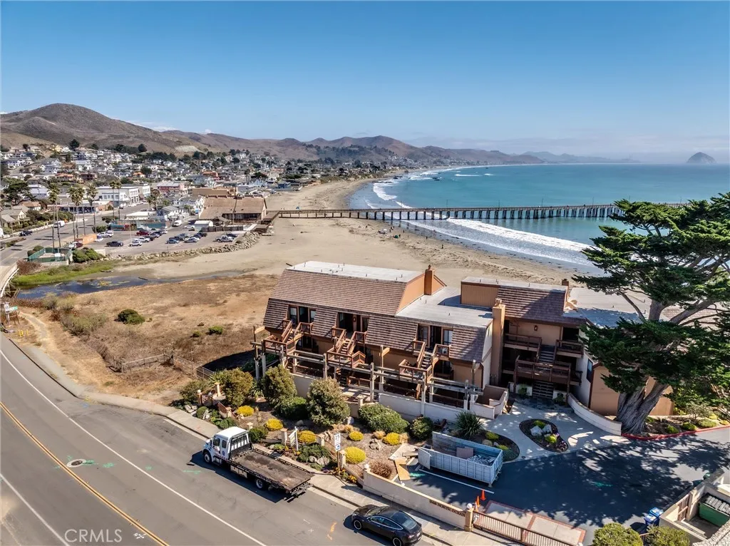Stellar Oceanfront Condo with Sweeping Coastal Views. Enjoy stunning panoramas of Estero Bay, Morro Rock, the pier, and Cayucos from this sought-after oceanfront complex with private beach access. This thoughtfully designed condo maximizes space with an efficient floor plan and easier access than upper levels. The open-concept great room flows seamlessly to an expansive oceanfront deck of over 300 sq. ft.—perfect for outdoor living and entertaining against a backdrop of ever-changing ocean views. The kitchen offers generous counter space and a custom pantry cabinet, while the adjacent living area provides direct access to the deck. An inside storage closet is conveniently located nearby, ideal for beach and deck essentials. The primary bedroom includes sliding-door access to the ensuite-style bath and opens directly to the deck for morning coffee with a view. A second entrance from the hall makes the bathroom easily accessible for guests and the additional bedroom. With its spacious deck, prime location, and smart design, this condo is a rare opportunity to embrace the best of coastal living.