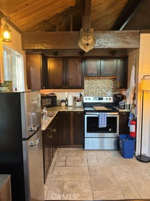 Good things come in small packages, just like this amazing light and bright chalet ready to generate you income when you're not using it. It has an updated kitchen with stone countertops & beautiful cabinetry, an open floor plan, updated bath, magical private back yard and soothing spa. It was recently replumbed and has a new tankless water heater, newer roof, dual pane windows, and the exterior paint is fresh. The outside feels even more spacious because it's located next to a large empty corner lot. It's being sold fully furnished with brand new furniture and a newly issued short term rental permit.