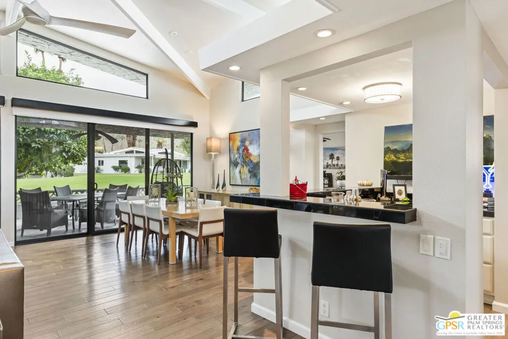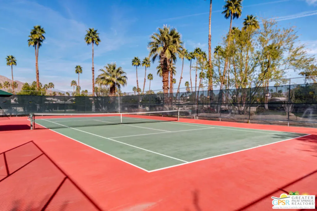 Experience Mid-Century Modern Living in Canyon Estates! Discover the hallmark of mid-century modern architecture in the sought-after Canyon Estates community, where acclaimed architect Charles E. Du Bois designed homes that blend timeless style, comfort, and sophistication - perfectly capturing the quintessential Palm Springs iconic lifestyle. Step through an elegant reeded glass double-door entry into a welcoming foyer that opens to a stunning living room, complete with a signature umbrella open beam style ceiling. Walls of glass and iconic clerestory windows frame dramatic east-facing mountain views and invite abundant natural light. The space flows seamlessly to a broad, covered patio overlooking a serene greenbelt with the mountains beyond - ideal for indoor-outdoor entertaining. A floor to ceiling stone-clad fireplace with white marble hearth and "Rat Pack" ready wet bar add to the authentic Palm Springs vibe. This thoughtfully upgraded, move-in-ready home is furnished in a warm neutral palette and features: 2 great ensuite primary bedrooms plus 2 additional bedrooms (currently used as a den and office), 3 well- appointed bathrooms, custom wood built-ins in the den, add functionality and elegance. Modern upgrades include all new Milgard windows, doors, and clerestory windows. A bonus eat-in breakfast area is perfect for morning coffee and extended views. This and much more in easy single level luxury living. Residents enjoy an array of amenities, including 15 pools, 12 spas, tennis and pickleball courts, a PAR-3 golf course, and a clubhouse with a newly upgraded fitness center. These offerings foster an active and social lifestyle in a resort-like environment. With its low-density layout, Canyon Estates provides generous open spaces, a peaceful setting, and a true sense of community.