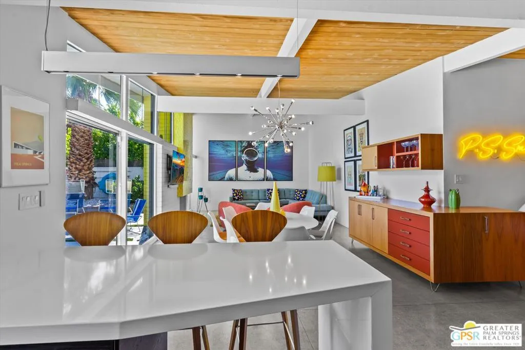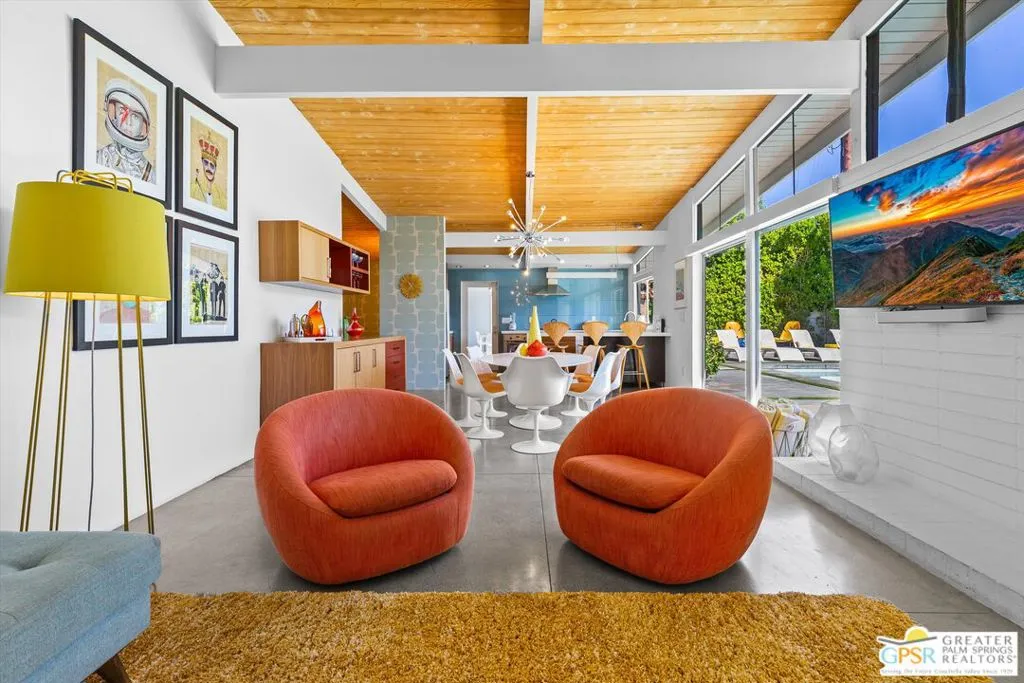 Renowned architect William Krisel is best known for his iconic butterfly roofline designs and likely created more of them than any other architect. This home is a perfect example of why his work was so important and continues to enthrall us to this day. The dramatic, soaring roof not only echoes the silhouette of the surrounding mountains but also allows for expansive clerestory windows that blur the line between indoors and out, flooding the interior with natural light and truly bringing the outdoors in. Krisel's designs for the Twin Palms neighborhood, developed in 1957 for the Alexander Construction Company, were elegantly simple, highly livable, and revolutionary in showing how cutting-edge architecture could be brought to the mainstream market. Now thoughtfully updated, this home invites you to experience Krisel's vision in a contemporary way. It features three bedrooms and two bathrooms, along with two additional bonus rooms accessed from the exterior, ideal for a studio, office, or guest space. The open-concept kitchen flows into the dining and living areas, which extend outward to a private pool, spa, and patio. A covered outdoor entertainment area with built-in BBQ completes this quintessential Palm Springs lifestyle experience.